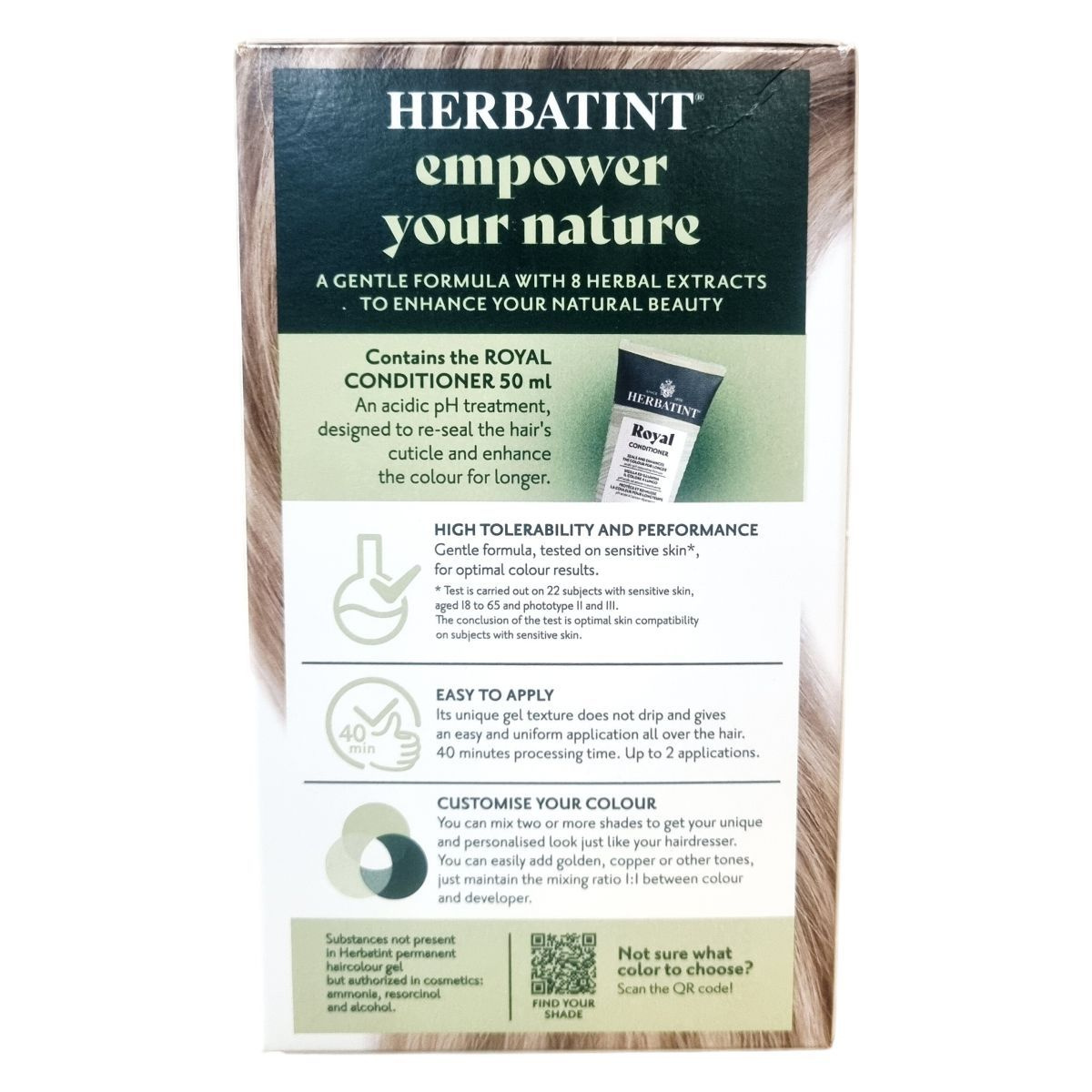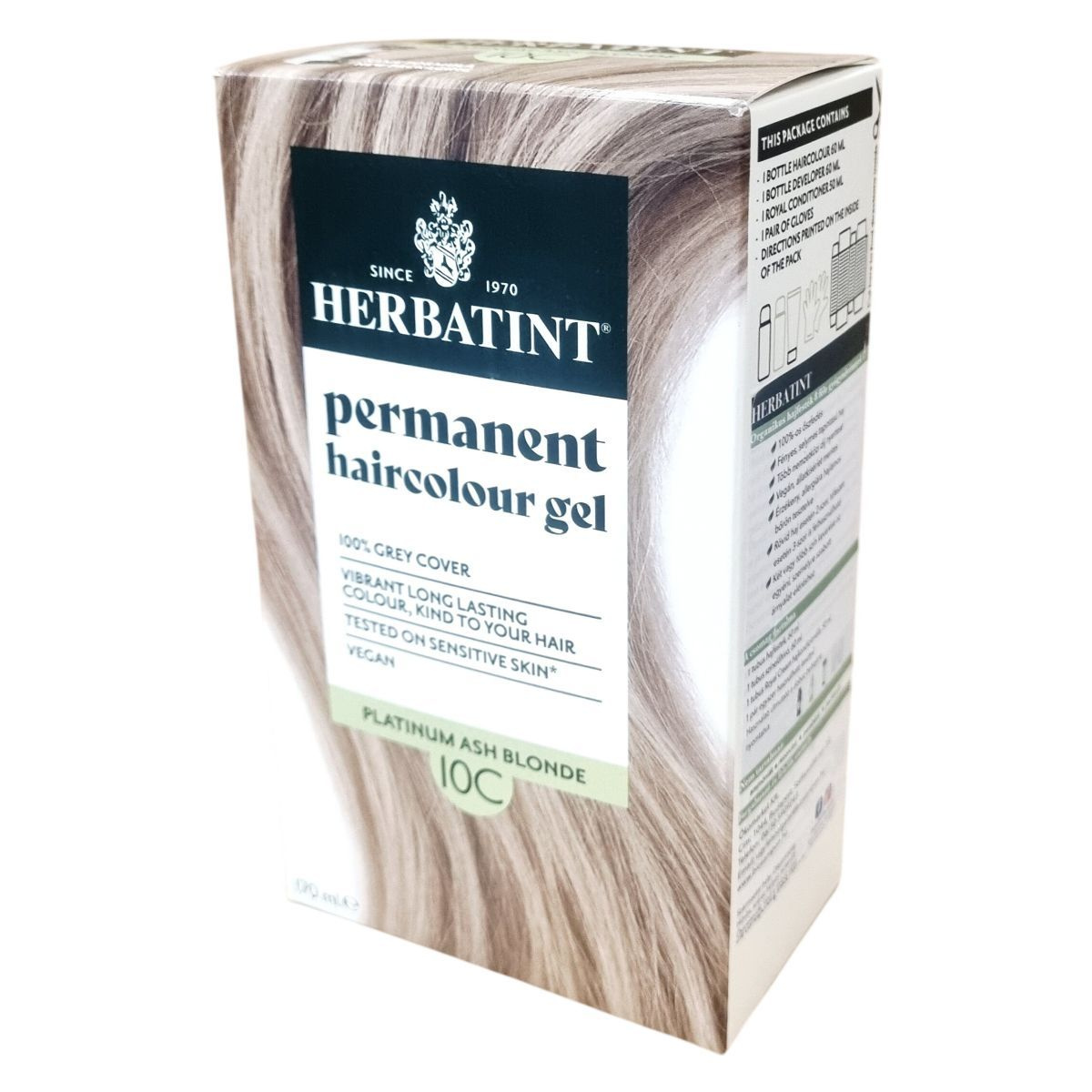 A Herbatint permanent haircolour gel egy gél állagú, csepegésmentes hajfesték, amely egyenletes felvitelt biztosít. A csomag tartalmaz egy 60 ml-es hajfestéket, egy 60 ml-es előhívót, egy 50 ml-es Royal Conditioner kondicionálót és egy pár kesztyűt. A Royal Conditioner savas pH-jú kezelés, amely segít a haj kutikulájának visszazárásában és a szín tartósságának növelésében. A feldolgozási idő 40 perc, a termék akár két alkalommal is felhasználható.