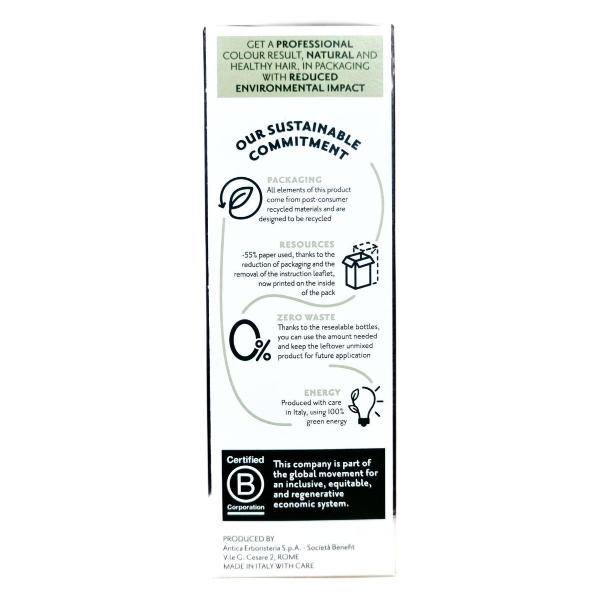 A csomagolás újrahasznosított anyagokból készül, csökkentett papírfelhasználással. Újrazárható flakonjai lehetővé teszik a maradék, nem összekevert termék későbbi felhasználását. Olaszországban gyártva, 100% zöld energiával.