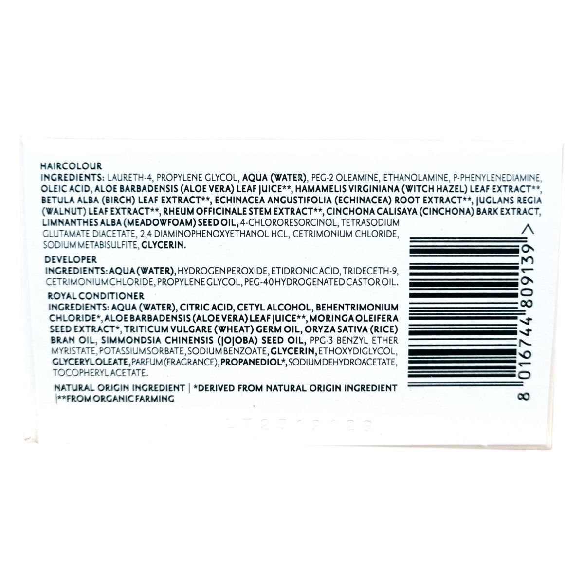 Hajfesték: Laureth-4, Propylene Glycol, Aqua (Water), PEG-2 Oleamine, Ethanolamine, Oleic Acid, P-Phenylenediamine, Aloe Barbadensis Leaf Juice, Hamamelis Virginiana Leaf Extract, Betula Alba Leaf Extract, Echinacea Angustifolia Root Extract, Juglans Regia Leaf Extract, Rheum Officinale Stem Extract, Cinchona Calisaya Bark Extract, Limnanthes Alba Seed Oil, 2-Amino-3-Hydroxypyridine, P-Aminophenol, Tetrasodium Glutamate Diacetate, 4-Chlororesorcinol, P-Methylaminophenol Sulfate, Cetrimonium Chloride, Sodium Metabisulfite, Glycerin.