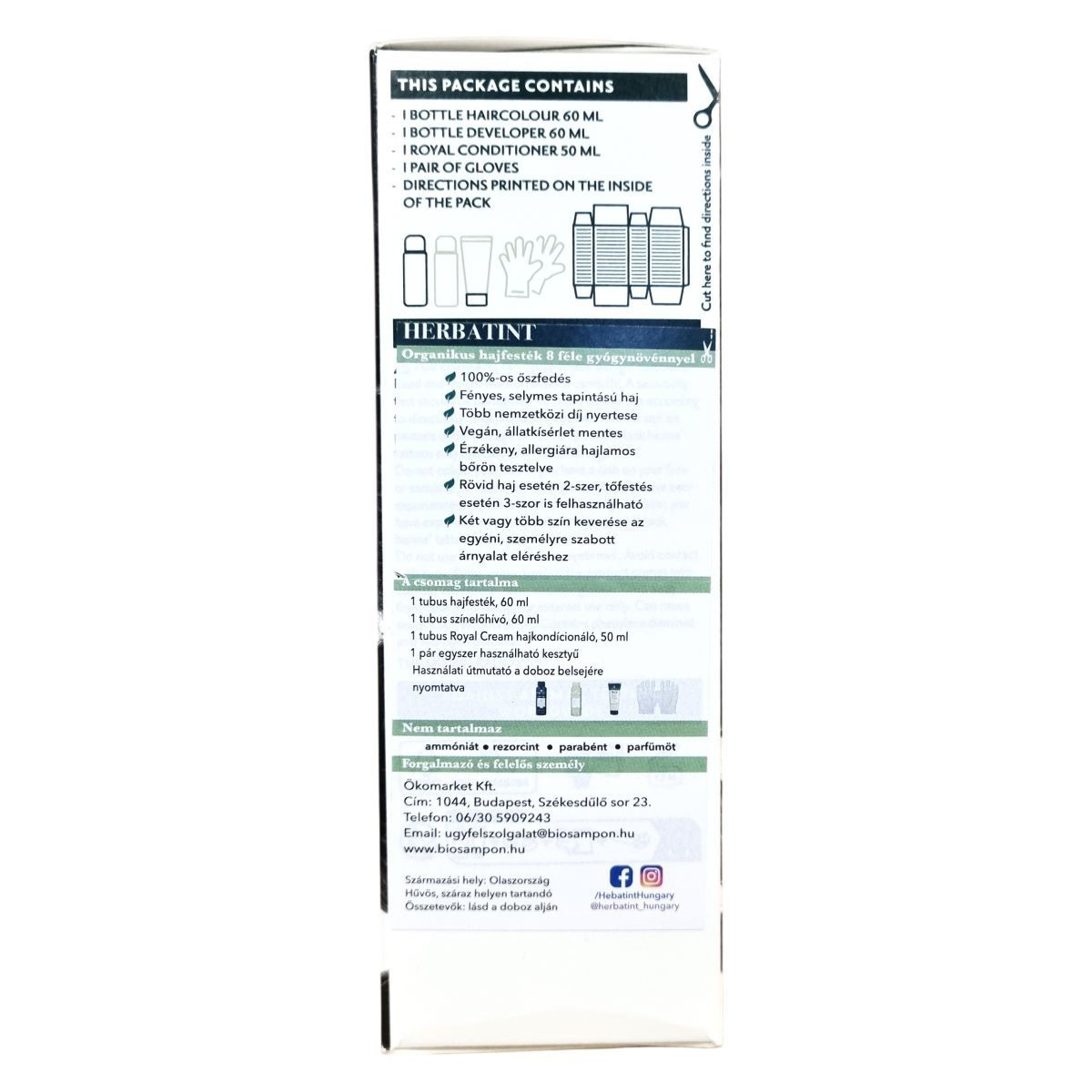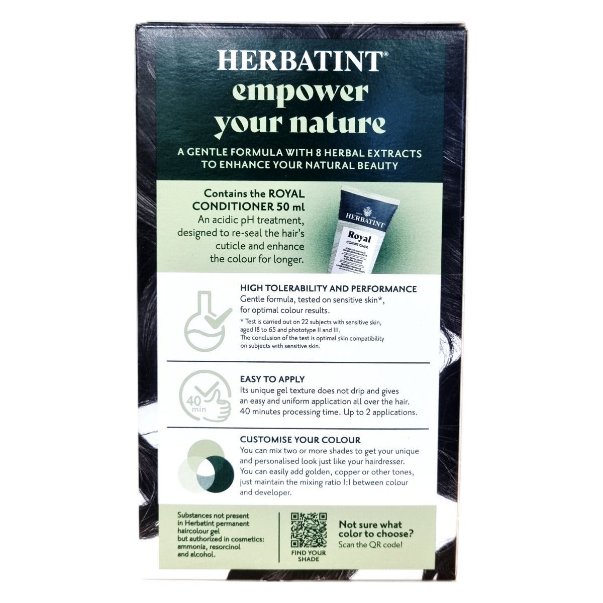 A Herbatint permanent haircolour gel egy gél állagú, csepegésmentes hajfesték, amely egyenletes felvitelt biztosít. A csomag tartalmaz egy 60 ml-es hajfestéket, egy 60 ml-es előhívót, egy 50 ml-es Royal Conditioner kondicionálót és egy pár kesztyűt. A Royal Conditioner savas pH-jú kezelés, amely segít a haj kutikulájának visszazárásában és a szín tartósságának növelésében. A feldolgozási idő 40 perc, a termék akár két alkalommal is felhasználható.