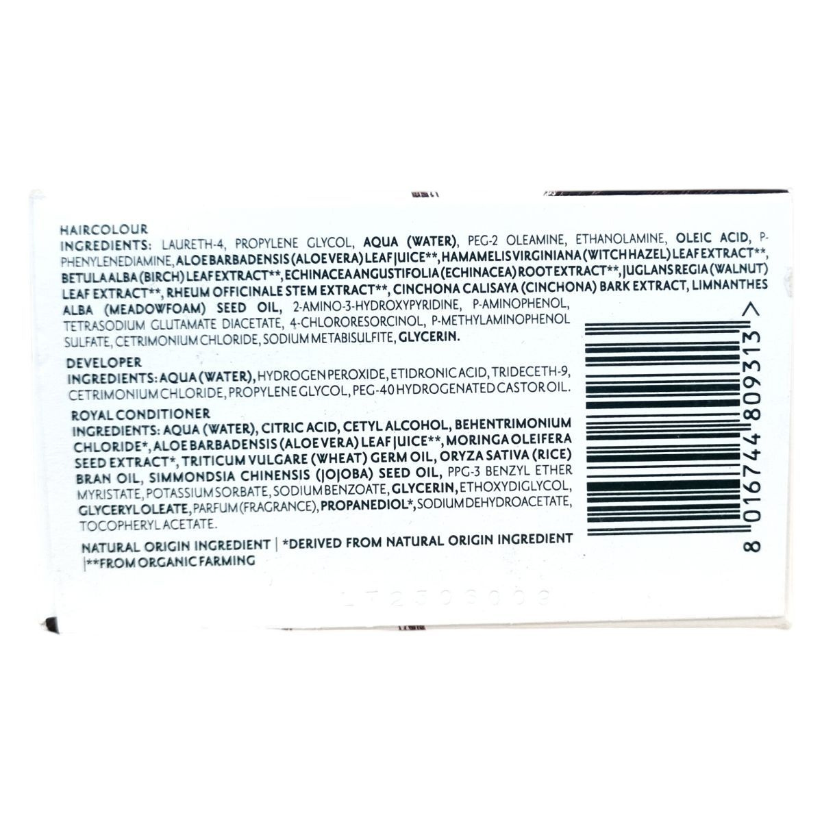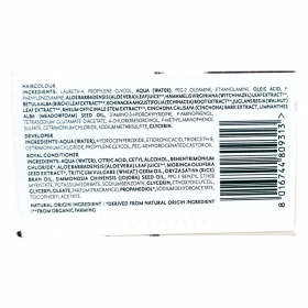 Hajfesték: Laureth-4, Propylene Glycol, Aqua (Water), PEG-2 Oleamine, Ethanolamine, Oleic Acid, P-Phenylenediamine, Aloe Barbadensis Leaf Juice, Hamamelis Virginiana Leaf Extract, Betula Alba Leaf Extract, Echinacea Angustifolia Root Extract, Juglans Regia Leaf Extract, Rheum Officinale Stem Extract, Cinchona Calisaya Bark Extract, Limnanthes Alba Seed Oil, 2-Amino-3-Hydroxypyridine, P-Aminophenol, Tetrasodium Glutamate Diacetate, 4-Chlororesorcinol, P-Methylaminophenol Sulfate, Cetrimonium Chloride, Sodium Metabisulfite, Glycerin.