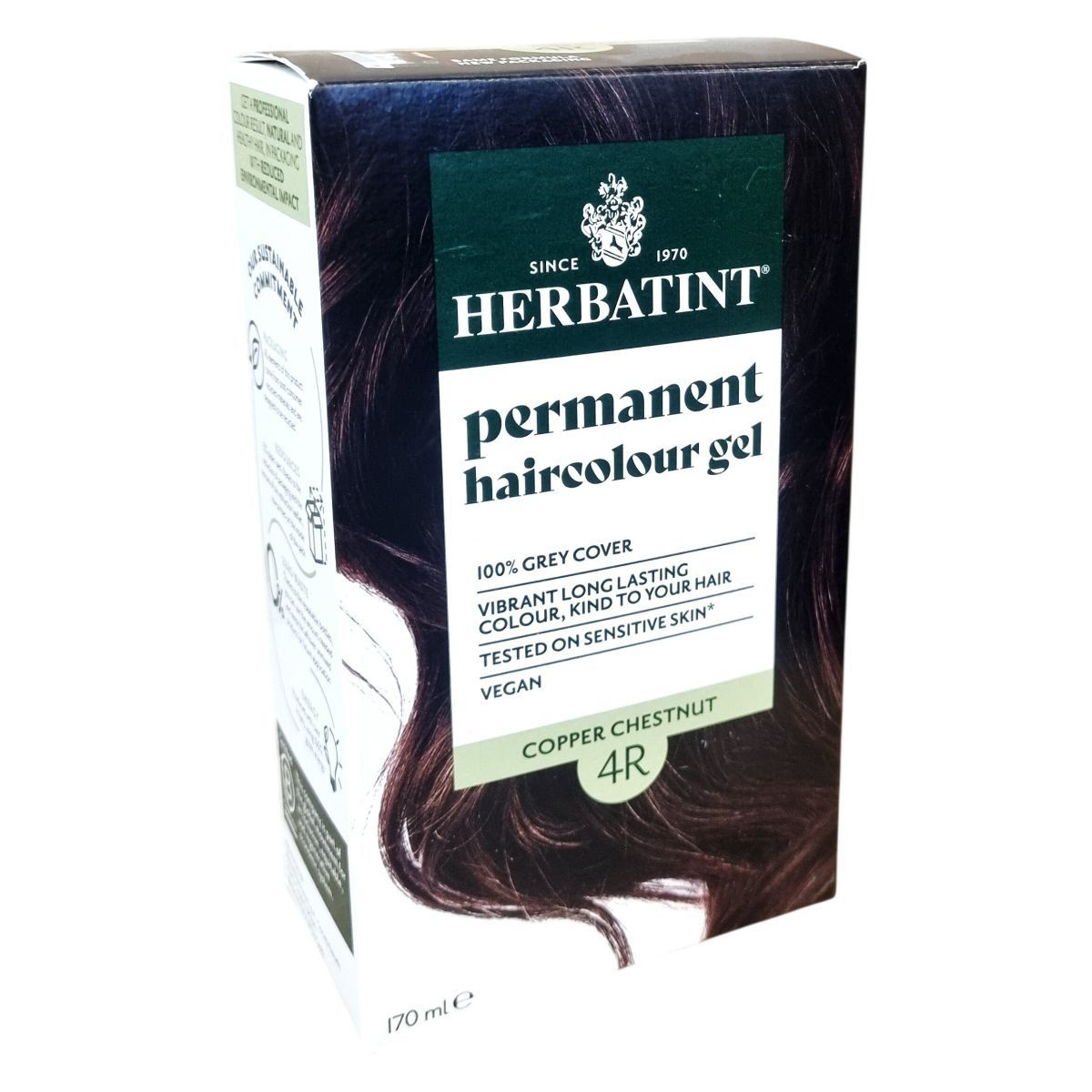 Gyengéd összetételű, réz-gesztenye színű, tartós hajfesték gél 100%-os ősz fedéssel. Növényi kivonatokat tartalmaz, érzékeny bőrön tesztelt, vegán formula.