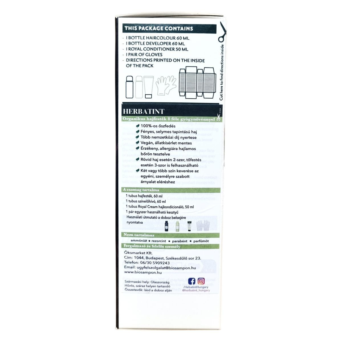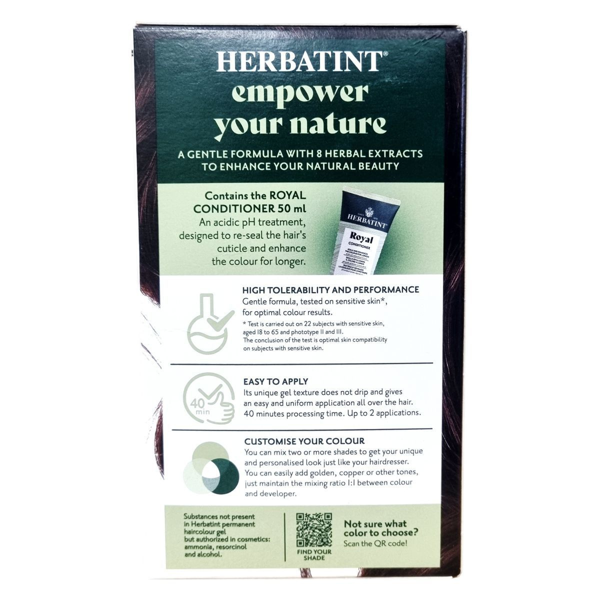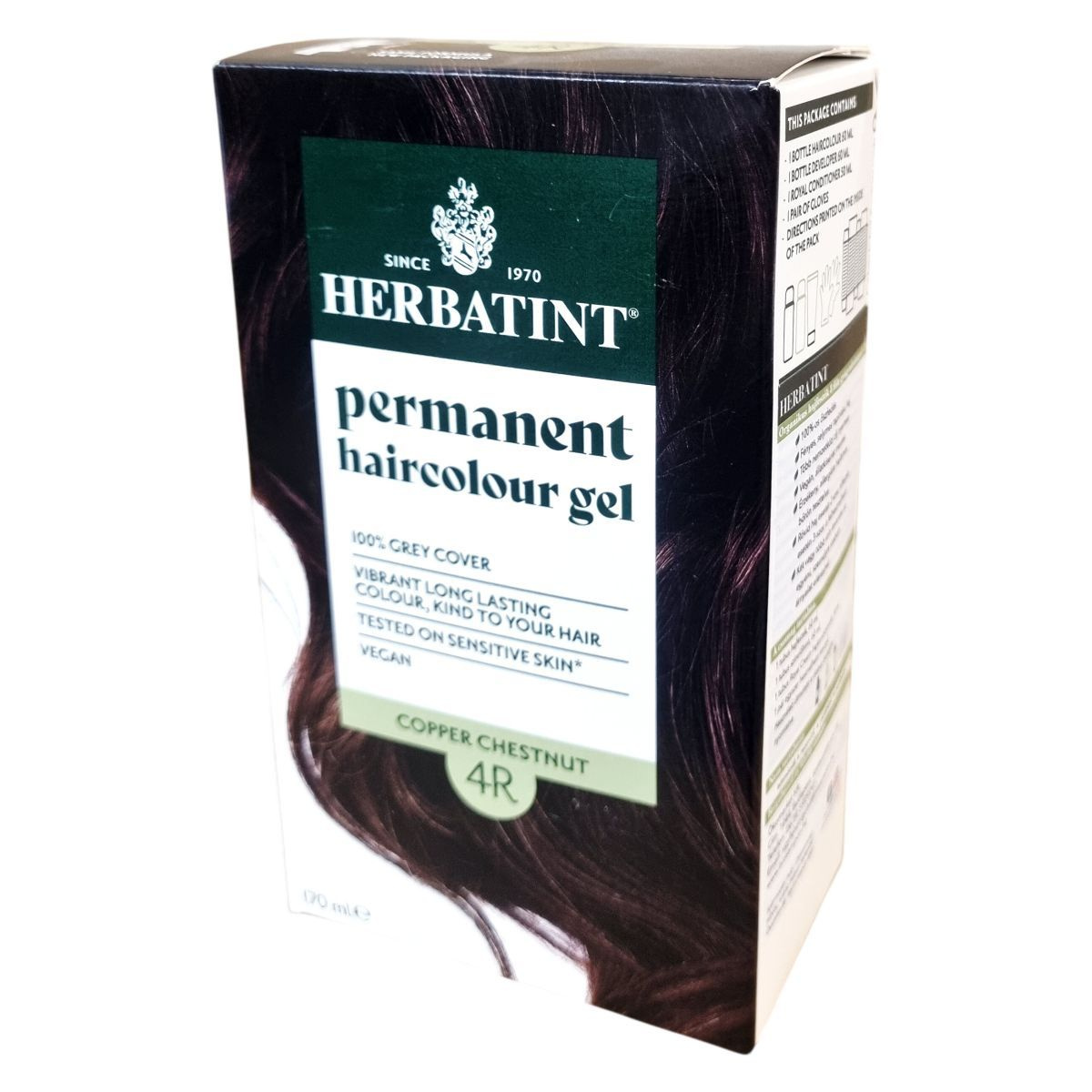 A Herbatint permanent haircolour gel egy gél állagú, csepegésmentes hajfesték, amely egyenletes felvitelt biztosít. A csomag tartalmaz egy 60 ml-es hajfestéket, egy 60 ml-es előhívót, egy 50 ml-es Royal Conditioner kondicionálót és egy pár kesztyűt. A Royal Conditioner savas pH-jú kezelés, amely segít a haj kutikulájának visszazárásában és a szín tartósságának növelésében. A feldolgozási idő 40 perc, a termék akár két alkalommal is felhasználható.