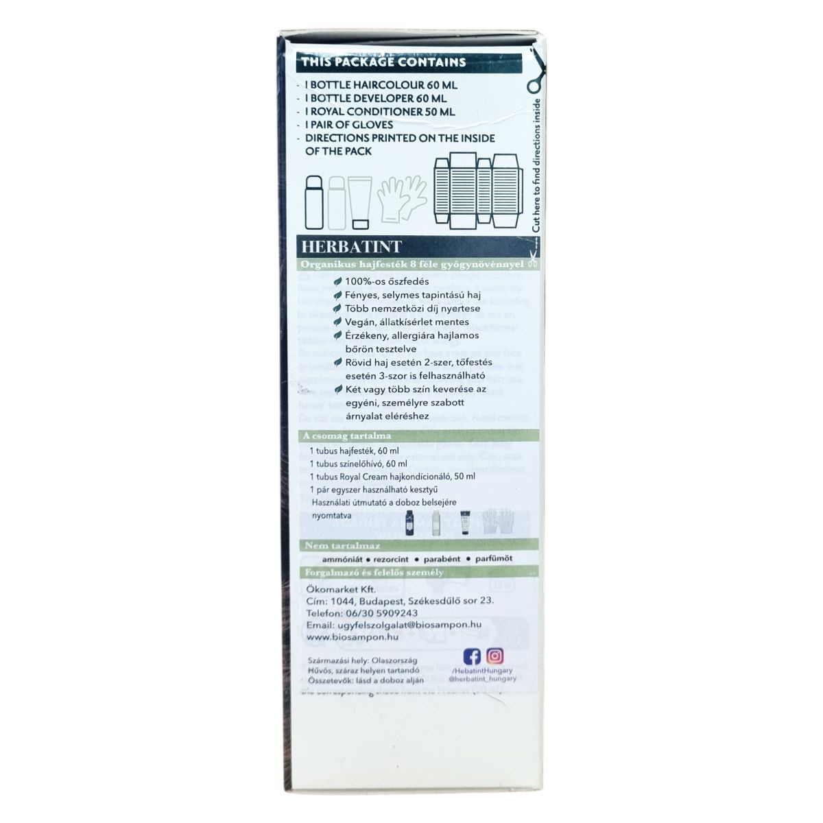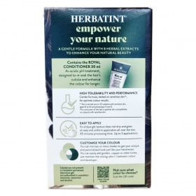 A Herbatint permanent haircolour gel egy gél állagú, csepegésmentes hajfesték, amely egyenletes felvitelt biztosít. A csomag tartalmaz egy 60 ml-es hajfestéket, egy 60 ml-es előhívót, egy 50 ml-es Royal Conditioner kondicionálót és egy pár kesztyűt. A Royal Conditioner savas pH-jú kezelés, amely segít a haj kutikulájának visszazárásában és a szín tartósságának növelésében. A feldolgozási idő 40 perc, a termék akár két alkalommal is felhasználható.