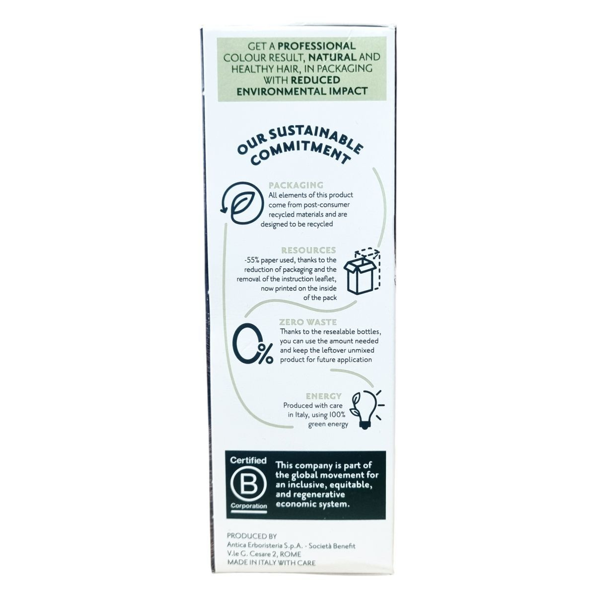 A csomagolás újrahasznosított anyagokból készül, csökkentett papírfelhasználással. Újrazárható flakonjai lehetővé teszik a maradék, nem összekevert termék későbbi felhasználását. Olaszországban gyártva, 100% zöld energiával.