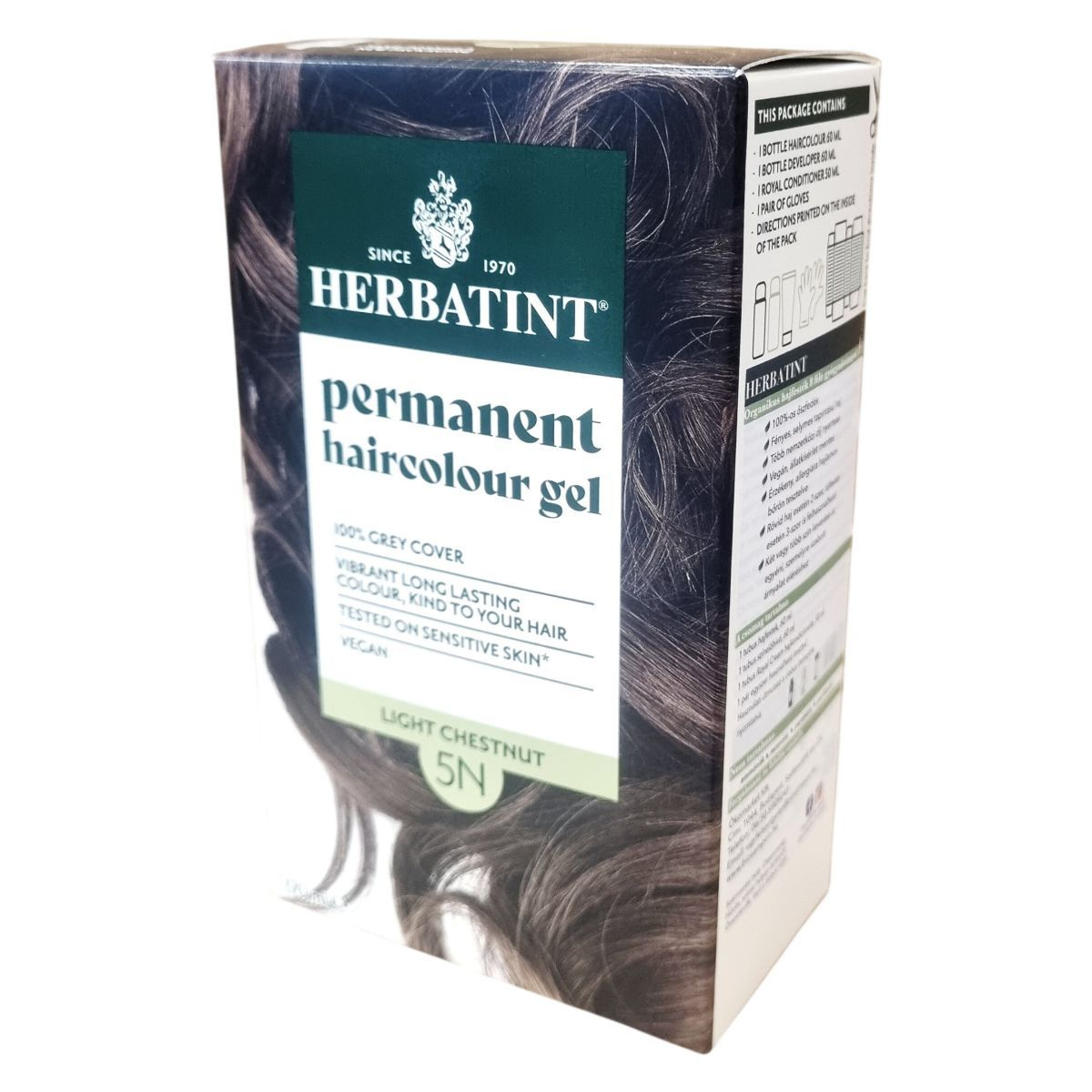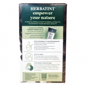 A Herbatint permanent haircolour gel egy gél állagú, csepegésmentes hajfesték, amely egyenletes felvitelt biztosít. A csomag tartalmaz egy 60 ml-es hajfestéket, egy 60 ml-es előhívót, egy 50 ml-es Royal Conditioner kondicionálót és egy pár kesztyűt. A Royal Conditioner savas pH-jú kezelés, amely segít a haj kutikulájának visszazárásában és a szín tartósságának növelésében. A feldolgozási idő 40 perc, a termék akár két alkalommal is felhasználható.