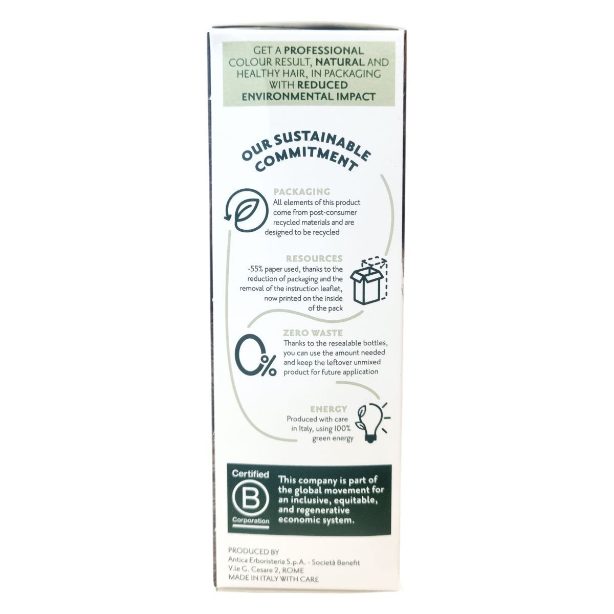 A csomagolás újrahasznosított anyagokból készül, csökkentett papírfelhasználással. Újrazárható flakonjai lehetővé teszik a maradék, nem összekevert termék későbbi felhasználását. Olaszországban gyártva, 100% zöld energiával.