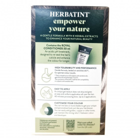 A Herbatint permanent haircolour gel egy gél állagú, csepegésmentes hajfesték, amely egyenletes felvitelt biztosít. A csomag tartalmaz egy 60 ml-es hajfestéket, egy 60 ml-es előhívót, egy 50 ml-es Royal Conditioner kondicionálót és egy pár kesztyűt. A Royal Conditioner savas pH-jú kezelés, amely segít a haj kutikulájának visszazárásában és a szín tartósságának növelésében. A feldolgozási idő 40 perc, a termék akár két alkalommal is felhasználható.