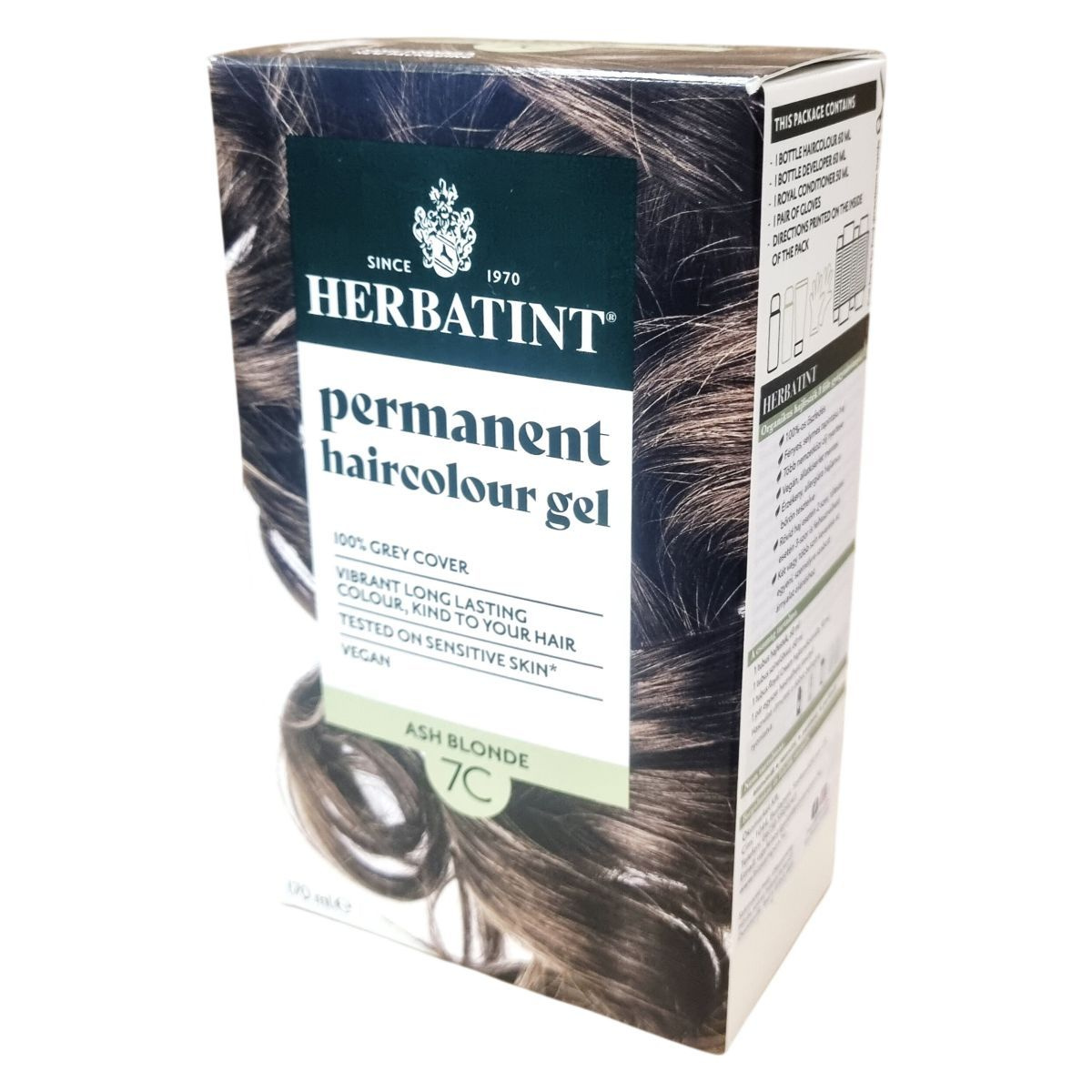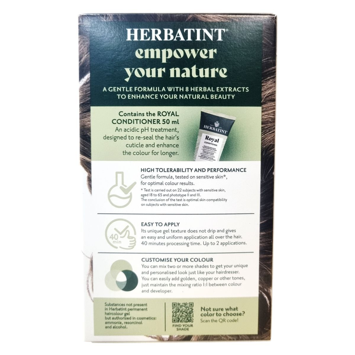 A Herbatint permanent haircolour gel egy gél állagú, csepegésmentes hajfesték, amely egyenletes felvitelt biztosít. A csomag tartalmaz egy 60 ml-es hajfestéket, egy 60 ml-es előhívót, egy 50 ml-es Royal Conditioner kondicionálót és egy pár kesztyűt. A Royal Conditioner savas pH-jú kezelés, amely segít a haj kutikulájának visszazárásában és a szín tartósságának növelésében. A feldolgozási idő 40 perc, a termék akár két alkalommal is felhasználható.