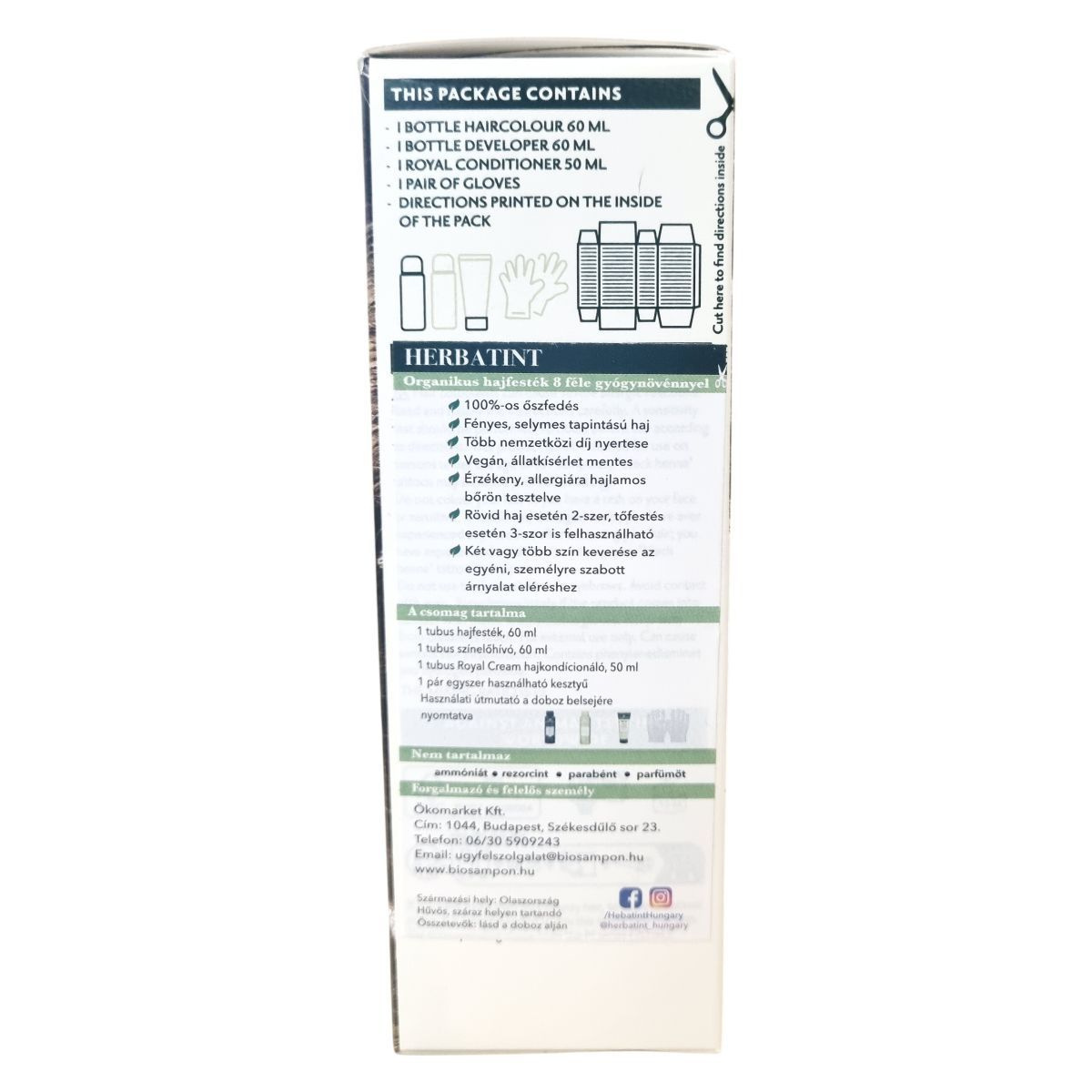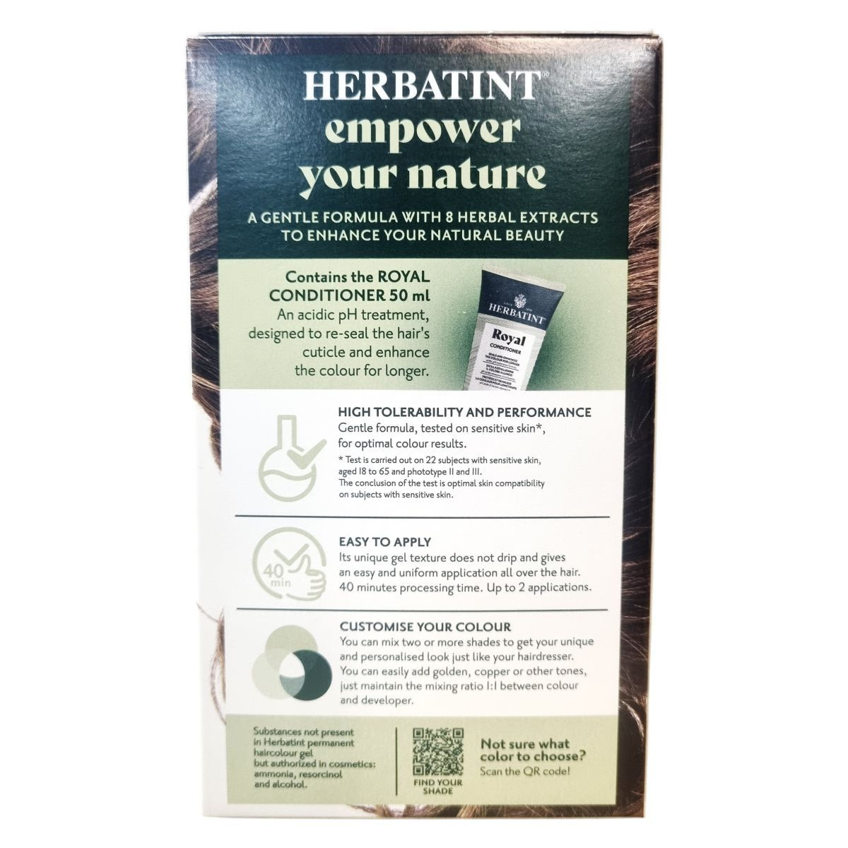 A Herbatint permanent haircolour gel egy gél állagú, csepegésmentes hajfesték, amely egyenletes felvitelt biztosít. A csomag tartalmaz egy 60 ml-es hajfestéket, egy 60 ml-es előhívót, egy 50 ml-es Royal Conditioner kondicionálót és egy pár kesztyűt. A Royal Conditioner savas pH-jú kezelés, amely segít a haj kutikulájának visszazárásában és a szín tartósságának növelésében. A feldolgozási idő 40 perc, a termék akár két alkalommal is felhasználható.