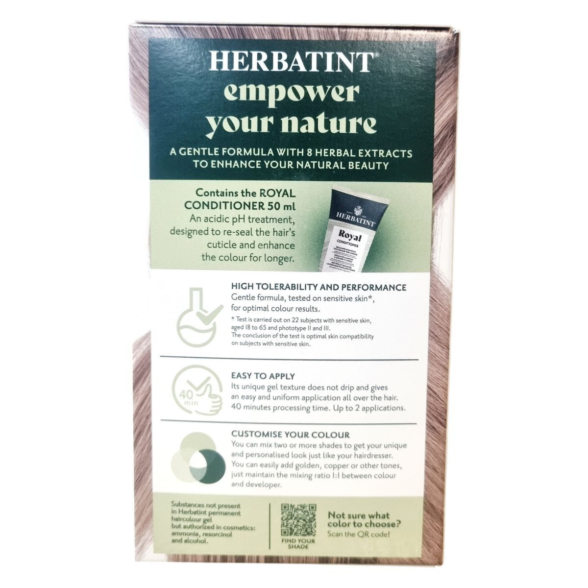 A Herbatint permanent haircolour gel egy gél állagú, csepegésmentes hajfesték, amely egyenletes felvitelt biztosít. A csomag tartalmaz egy 60 ml-es hajfestéket, egy 60 ml-es előhívót, egy 50 ml-es Royal Conditioner kondicionálót és egy pár kesztyűt. A Royal Conditioner savas pH-jú kezelés, amely segít a haj kutikulájának visszazárásában és a szín tartósságának növelésében. A feldolgozási idő 40 perc, a termék akár két alkalommal is felhasználható.