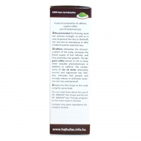 A termék prémium minőségű, kizárólag hazai összetevőket tartalmazó hajcsepp innovatív formulával készült a haj teljes körű regenerálására. A koffein serkenti a fejbőr mikrokeringését, fokozza a hajhagymák vérellátását, elősegítve ezzel a haj növekedését. A biokávé kivonat a koffeinen túl sok értékes fitokémiai anyagot tartalmaz, amelyekkel együtt a 25 gyógynövény összetevői intenzíven táplálják és erősítik a hajhagymákat, valamint csökkentik vagy megszüntetik a túlzott hajhullást és a korpásodást. A termék hatékony megoldás ritkuló, erőtlen hajra, hajhullás ellen változó korban, szülés után, illetve férfiaknál jelentkező hajhullás esetén. Használata egyszerű, a szórófej segítségével közvetlenül a fejbőrre juttatható, támogatva a hajnövekedési folyamatokat pénzvisszafizetési garanciával.