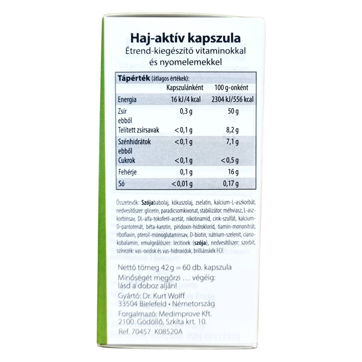 A haj-aktív kapszula egy kiegyensúlyozott formula vitaminokkal, nyomelemekkel és értékes növényi kivonatokkal, melyek hozzájárulhatnak a haj egészségéhez, valamint a fejbőr állapotának javításához. A benne található biotin és cink támogatják a hajhagymák és a fejbőr vitalitását, míg a szelén fontos nyomelemként segítheti a hajszerkezet megerősítését. Az egészséges fejbőr elősegítheti a haj erőteljes növekedését, míg a megfelelő tápanyagellátás hozzájárulhat a hajszálak egészségéhez, megakadályozva a szárazságot, törékenységet és vékonyságot. A termék laktóz- és gluténmentes, így érzékenyek számára is alkalmas lehet.