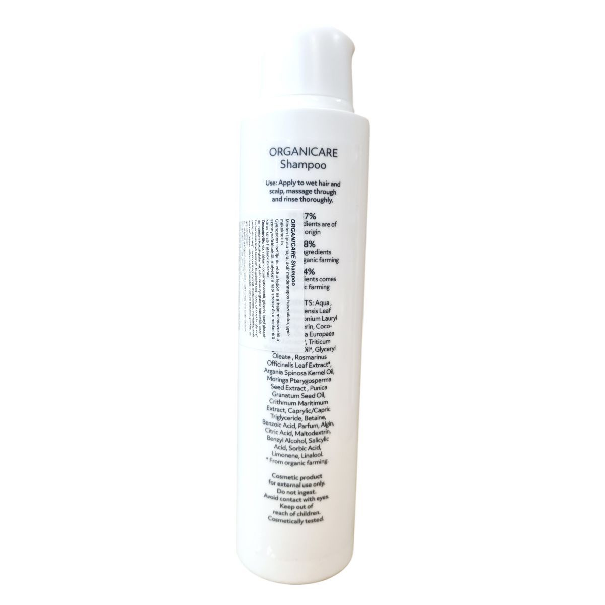 Az OrganiCare sampon minden hajtípusra alkalmas, kíméletesen tisztít és megőrzi a fejbőr egészségét. Az összetevők között megtalálhatók bio minősítésű gyógynövényi kivonatok, mint az aloe vera, rozmaring és moringa, valamint természetes olajok, amelyek táplálják a hajszálakat. A termék bőrgyógyászatilag tesztelt, vegánbarát és környezetbarát csomagolásban érkezik. A készítmény az EU területén készült, és kizárólag külső használatra szánt.