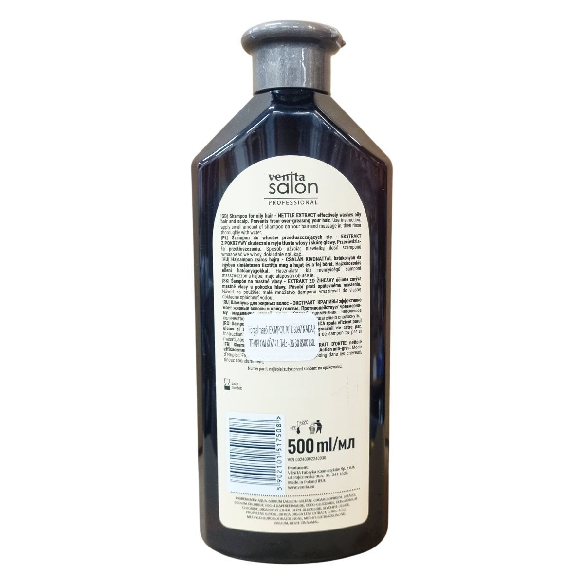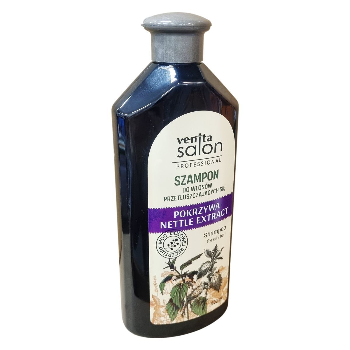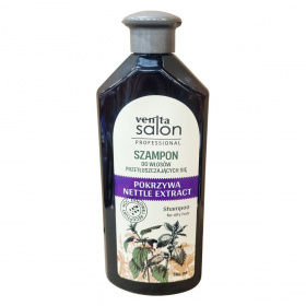 A Venita Salon Professional szampon zsíros hajra csalán kivonattal készült, amely hatékonyan, de kíméletesen tisztítja a hajat és a fejbőrt, megelőzve a haj túlzott zsírosodását. A termék 500 ml kiszerelésű, és egyszerű használatot biztosít, ahol kis mennyiségű sampont kell a hajra masszírozni, majd alaposan leöblíteni. Az összetevői között megtalálható a csalán levél kivonata, amely természetes módon támogatja a fejbőr egészségét. A sampont a Venita Fabryka Kosmetyków Sp. z o.o. gyártja Lengyelországban, és az EXIMPOIL KFT. forgalmazza. A termék címkéjén feltüntetik a gyártási tételszámot, továbbá figyelmet fordítanak arra, hogy a szavatossági idő a csomagoláson található. Az összetevőlistában több tisztító és ápoló alkotóelem is szerepel, továbbá tartalmaz illatanyagokat is. A szampon használatával hatékonyan kezelhető a zsíros haj, miközben biztosítja a friss és tiszta érzést.