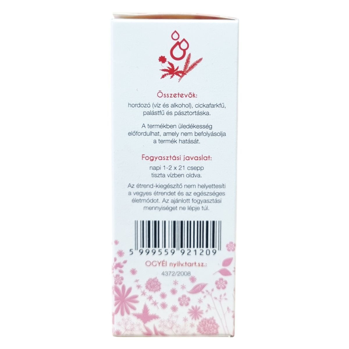 Hordozó (víz és alkohol), cickafarkfű, palástfű, pásztortáska.