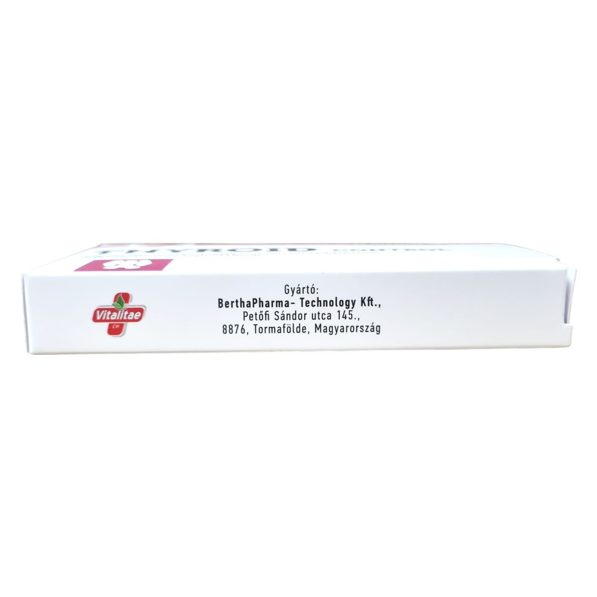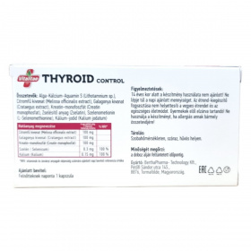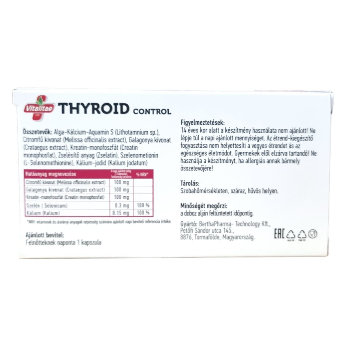 A Vitalitae CH Thyroid Control egy biológiailag aktív étrend-kiegészítő kapszula, amely gyógynövényeket és ásványi anyagokat ötvöz. A termék alapját az Alga-Kálcium-Aquamin S képezi, amely Lithothamnium sp. algából származik, emellett tartalmaz citromfű és galagonya kivonatot, kreatin-monofoszfátot, szelenometionint és kálium-jodidot. A kapszula zselésítő anyaga zselatin. A szelén és kálium mennyisége az ajánlott napi bevitel 100%-át tartalmazza. A készítményt 14 éves kor alatt nem javasolt használni. Az ajánlott napi mennyiség felnőttek számára 1 kapszula, amely nem helyettesíti a vegyes étrendet és az egészséges életmódot. Tartsa gyermekektől távol, és kerülje az allergiát okozó anyagokat.