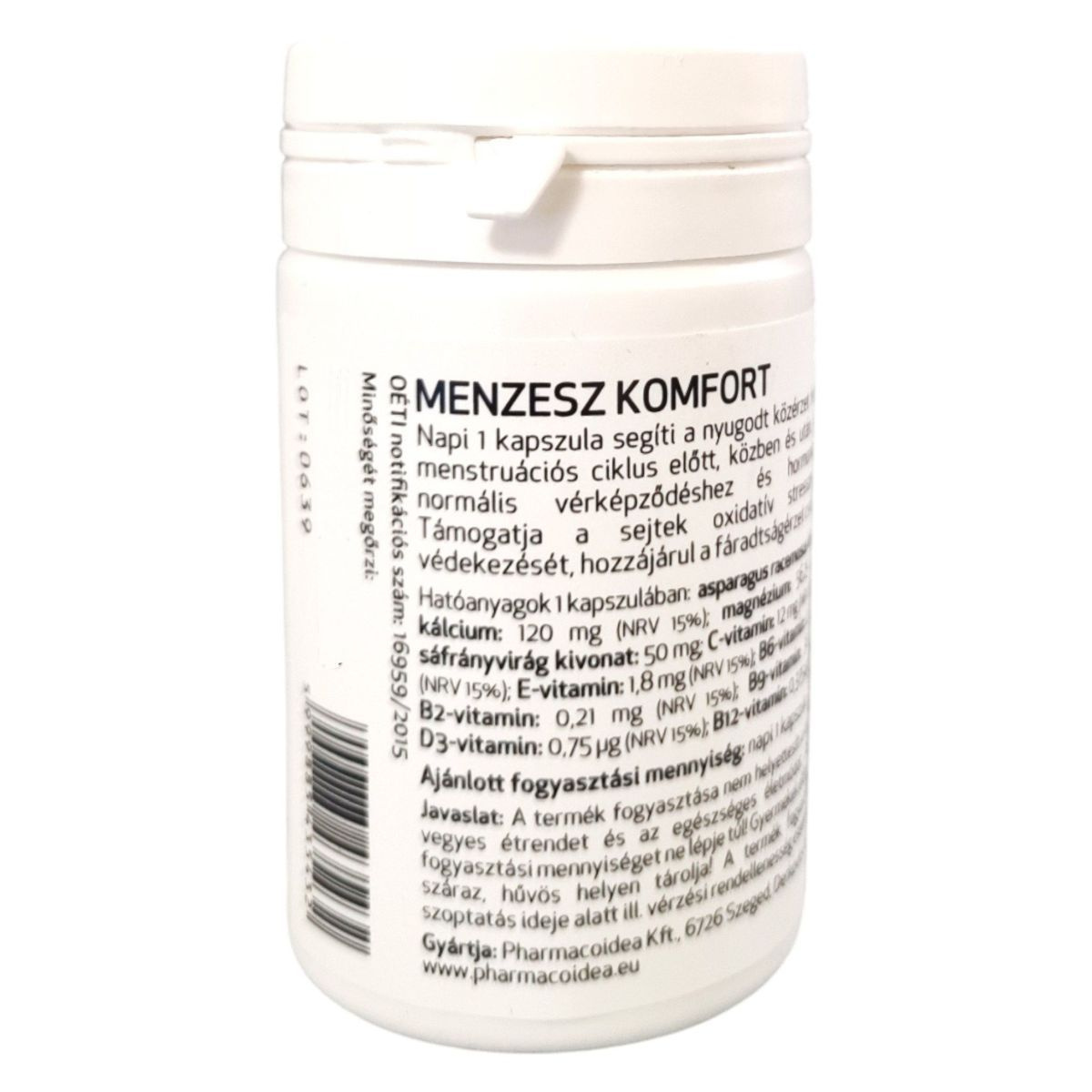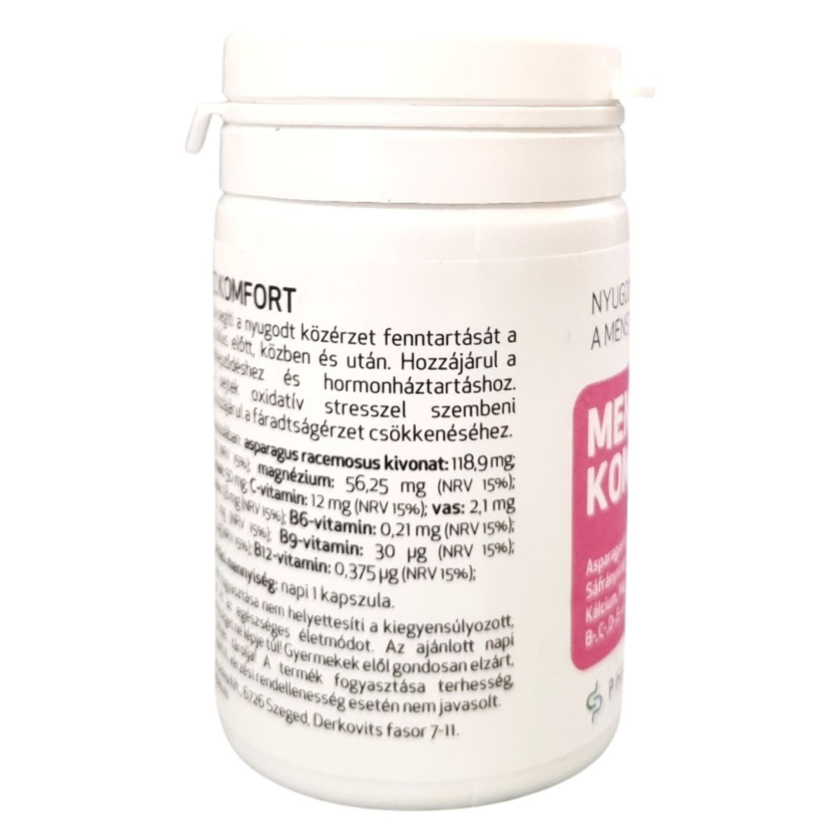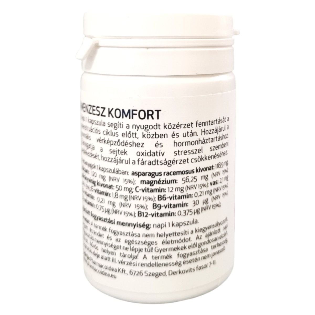 A Menzesz Komfort kapszula a menstruációs ciklus különböző szakaszaiban támogathatja a nyugodt közérzet fenntartását. A termék hatóanyagai, mint az asparagus racemosus és a sáfrányvirág kivonat, valamint a különböző vitaminok és ásványi anyagok, hozzájárulhatnak a normális vérképződéshez és hormonháztartáshoz. Emellett segíthetnek a sejtek oxidatív stresszel szembeni védekezésében és a fáradtságérzet csökkentésében. A termék fogyasztása nem javasolt terhesség és szoptatás ideje alatt, valamint vérzési rendellenesség esetén.
