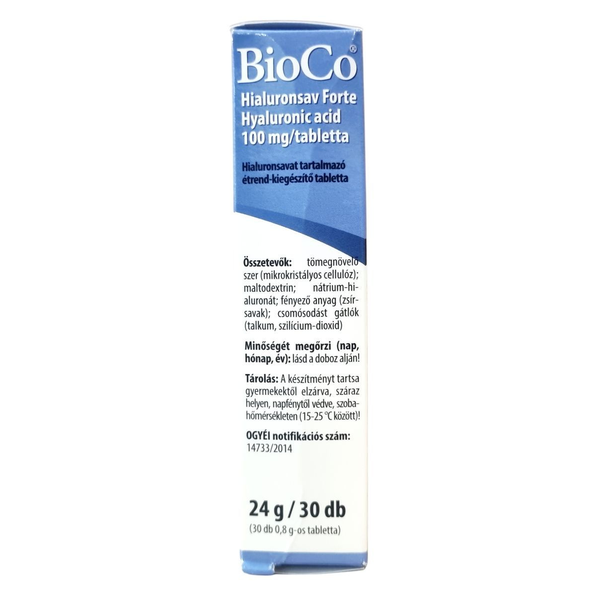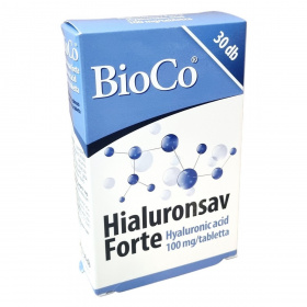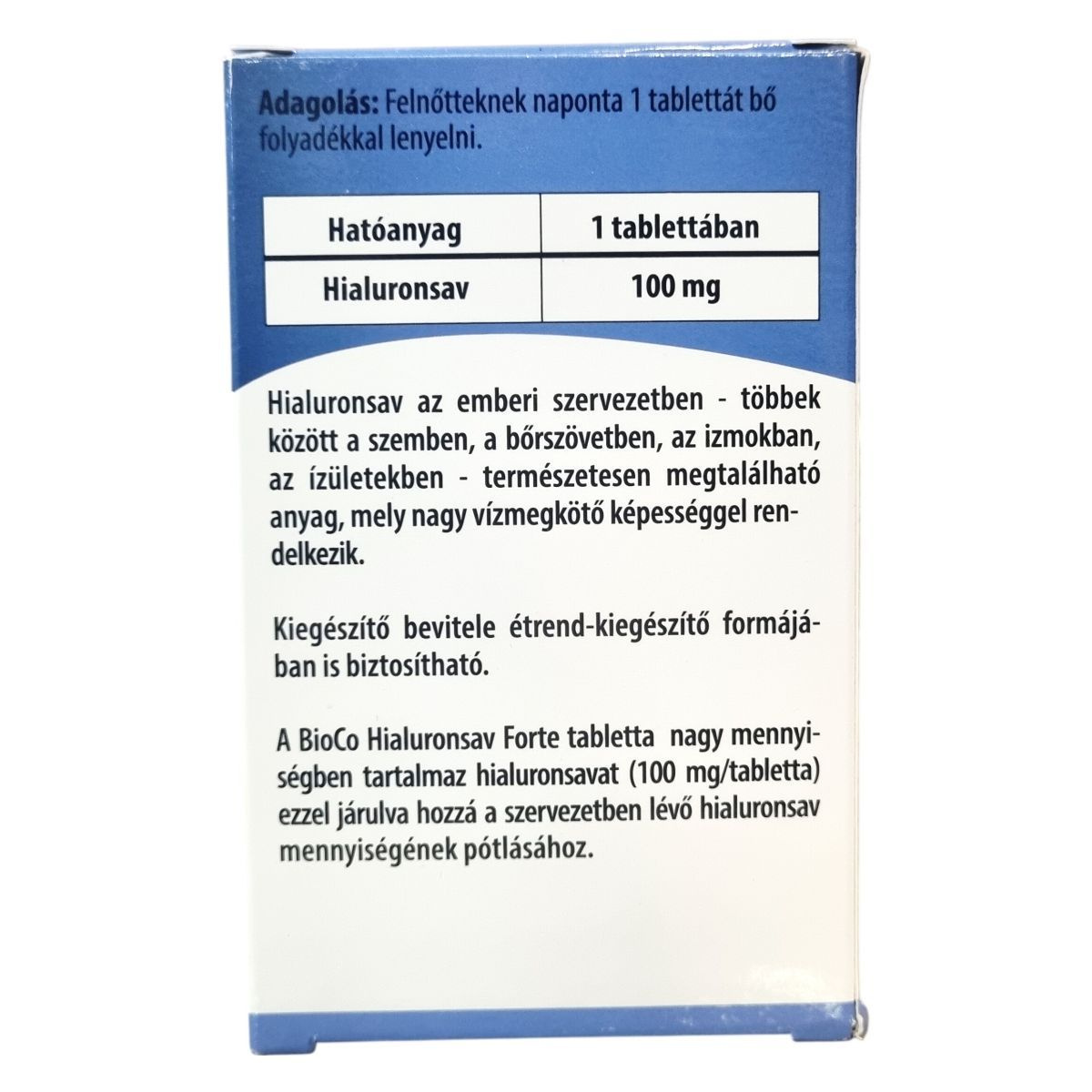 A BioCo Hialuronsav Forte tabletta 100 mg hialuronsavat tartalmaz tablettánként, ez az összetevő az emberi szervezetben is természetes módon jelen van, például a szemben, a bőrszövetben, az izmokban és az ízületekben, valamint jelentős vízmegkötő képességgel rendelkezik. A termék kizárólag Magyarországon készül és fejlesztik, bár a hatóanyag nem innen származik. A gyártás megfelel az ISO 22000 élelmiszerbiztonsági szabványnak és a Jó Gyártási Gyakorlat (GMP) előírásainak, amelyek garantálják a termék minőségét és biztonságosságát.