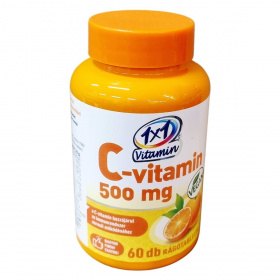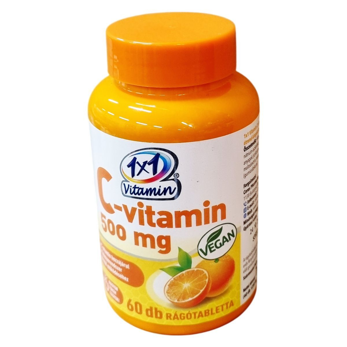 Az 1x1 Vitamin C-vitamin rágótabletta 500 mg C-vitamint tartalmaz, amely hozzájárulhat az immunrendszer normál működéséhez. Narancsízű, édesítőszerrel készült termék, amely sorbitot és szukralózt tartalmaz. A készítmény csomósodást gátló anyagokat, maltodextrint, narancs aromát és gumiarábikum stabilizátort is tartalmaz. Nettó tömege 75 g, ami 60 darab 1250 mg-os rágótablettának felel meg. Magyarországi forgalmazója a Ceres Pharma Hungary Kft. A termék származási helye az Európai Unió. Kérjük, a gyermekek elől való gondos elzárást és az adagolás betartását, továbbá a termék csomagolásának megfelelő kezelését a minőség megőrzése érdekében.