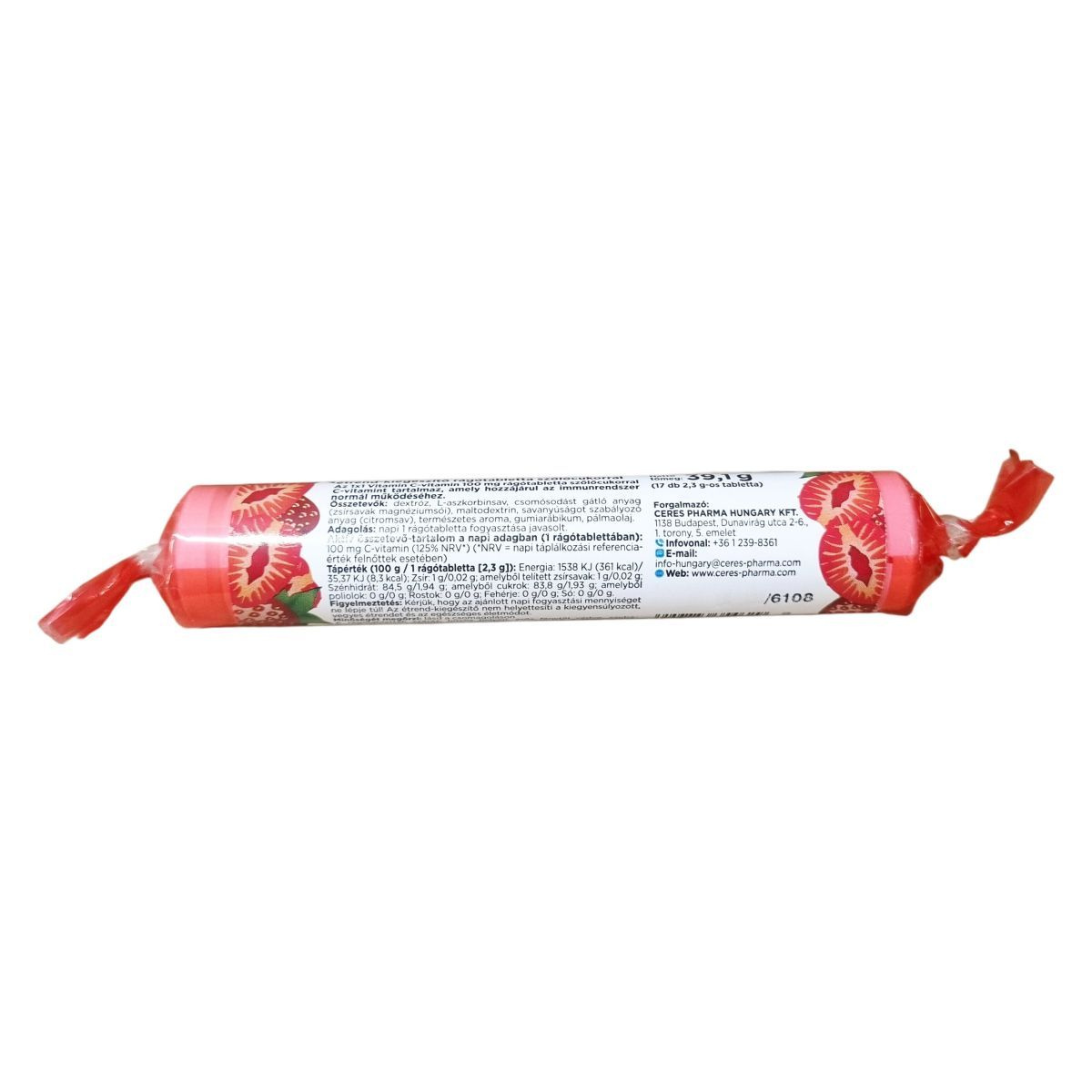 Eperízű, szőlőcukorral készült étrend-kiegészítő rágótabletta. Aktív összetevő-tartalom a napi adagban (1 rágótablettában): 100 mg C-vitamin (125% NRV). Származási hely: EU. Nettó tömeg: 39,1 g (17 db 2,3 g-os tabletta). Vonalkód: 5999883354629. Azonosítók: /G108, IP361400.