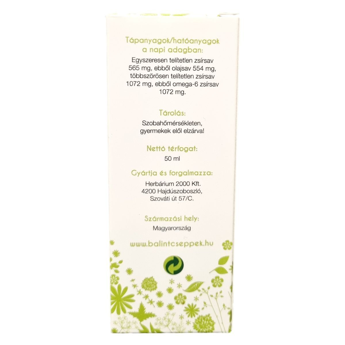 A BÁLINT OREGÁNÓ kukoricacsíra-olajos kivonata természetes összetevőkből készül, emellett több mint 70%-ban tartalmaz telítetlen zsírsavakat, amelyek között magas az omega-6 zsírsav aránya. Ezek az összetevők elősegíthetik az egészséges zsírsavegyensúly fenntartását szervezetében. A készítmény napi adagja 2 ml, amelyet reggel ajánlott fogyasztani. A termék Magyarországon készül, és megfelel az élelmiszerbiztonsági előírásoknak. Nettó térfogata 50 ml.