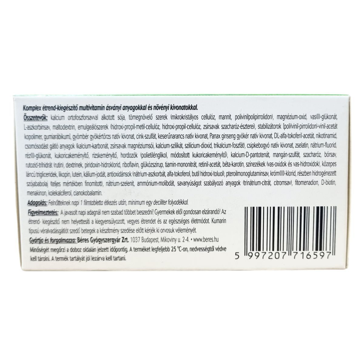 kalcium ortofoszforsavval alkotott sója, mikrokristályos cellulóz, mannit, polivinilpolipirrolidon, magnézium-oxid, vas(II)-glükonát, L-aszkorbinsav, maltodextrin, hidroxipropil-metil-cellulóz, hidroxipropil-cellulóz, zsírsavak szacharóz-észterei, polivinil-pirrolidon-vinil-acetát kopolimér, gumiarábikum, gyömbér gyökértörzs natív kivonat, cink-szulfát, keserűnarancs natív kivonat, Panax ginseng gyökér natív kivonat, DL-alfa-tokoferil-acetát, nikotinamid, kalcium-karbonát, zsírsavak magnéziumsói, kalcium-szilikát, szilícium-dioxid, trikalcium-foszfát, csipkebogyó natív kivonat, zselatin, nátrium-fluorid, réz(II)-glükonát, kukoricakeményítő, rizskeményítő, polietilénglikol, módosított kukoricakeményítő, kalcium-D-pantotenát, mangán-szulfát, szacharóz, bórsav, rutozid-trihidrát, dextrinek, piridoxin-hidroklorid, riboflavin, glükózszirup, tiamin-mononitrát, retinil-acetát, béta-karotin, vas-oxidok és vas-hidroxidok, közepes láncú trigliceridek, likopin, lutein, kálium-jodát, nátrium-aszkorbát, alfa-tokoferol, butil hidroxi-toluol, pteroilmonoglutaminsav, króm(III)-klorid, részben hidrogénezett szójababolaj, nátrium-szelenit, ammónium-molibdát, trinátrium-citrát, citromsav, fitomenadion, D-biotin, menakinon, kolekalciferol, cianokobalamin