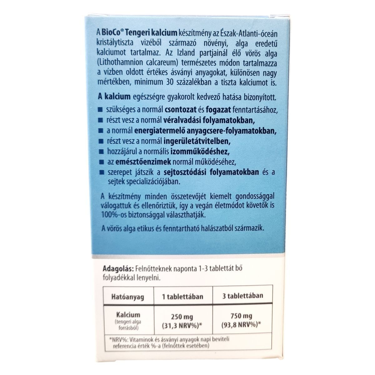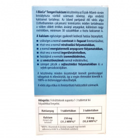 Kalcium (tengeri alga forrásból) 250 mg tablettánként, 750 mg 3 tablettában.