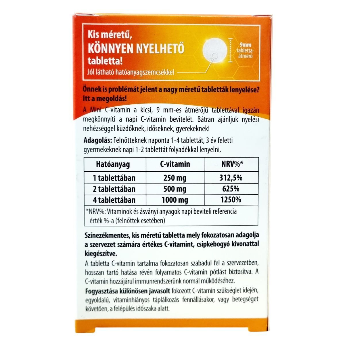 A Mini C-vitamin kis méretű, 9 mm átmérőjű tabletta, amely megkönnyítheti a C-vitamin napi bevitelét különösen nyelési nehézséggel küzdők, idősek és gyermekek számára. A tabletta C-vitamin tartalma fokozatosan szabadul fel, így hosszan tartó hatást biztosíthat, támogatva folyamatos C-vitamin pótlást. A termék csipkebogyó kivonatot is tartalmaz, és színezékmentes. Magyar fejlesztésű és gyártású, a hatóanyag azonban nem Magyarországról származik. A gyártó élelmiszerbiztonsági rendszere ISO 22000 szabvány és Jó Gyártási Gyakorlat (GMP) irányelvek szerint tanúsított.