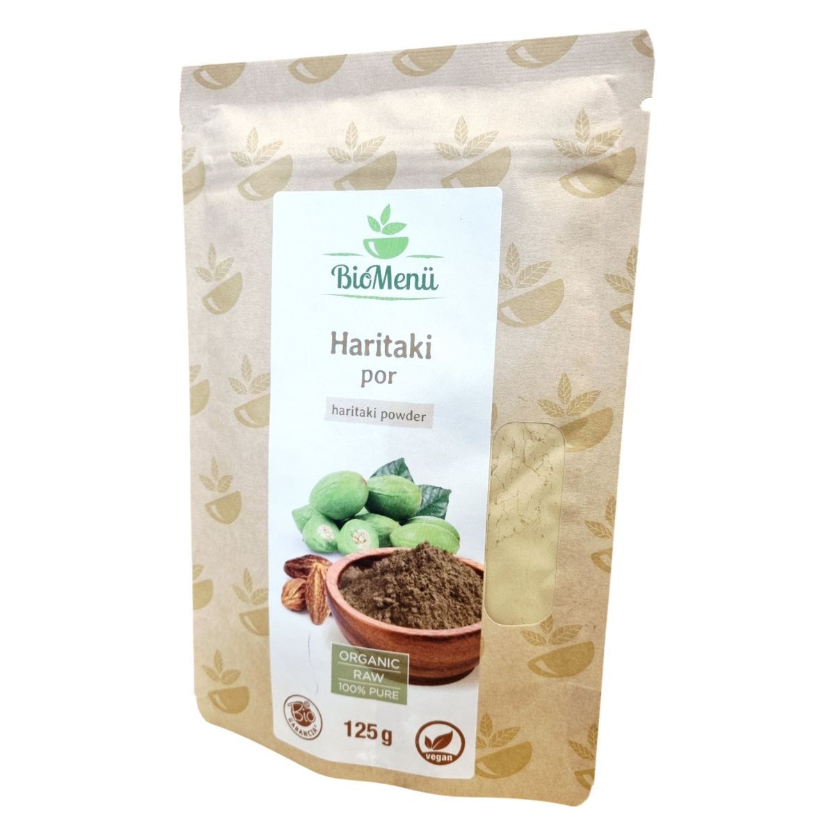 A BioMenü Haritaki por 100% bio haritaki (Terminalia chebula) összetevőt tartalmaz, amely támogathatja az egészséges életmódot. Az indiai cserzőgubacs por formájában érhető el, és vegán, bio és raw étrendi irányzatoknak is megfelelhet.