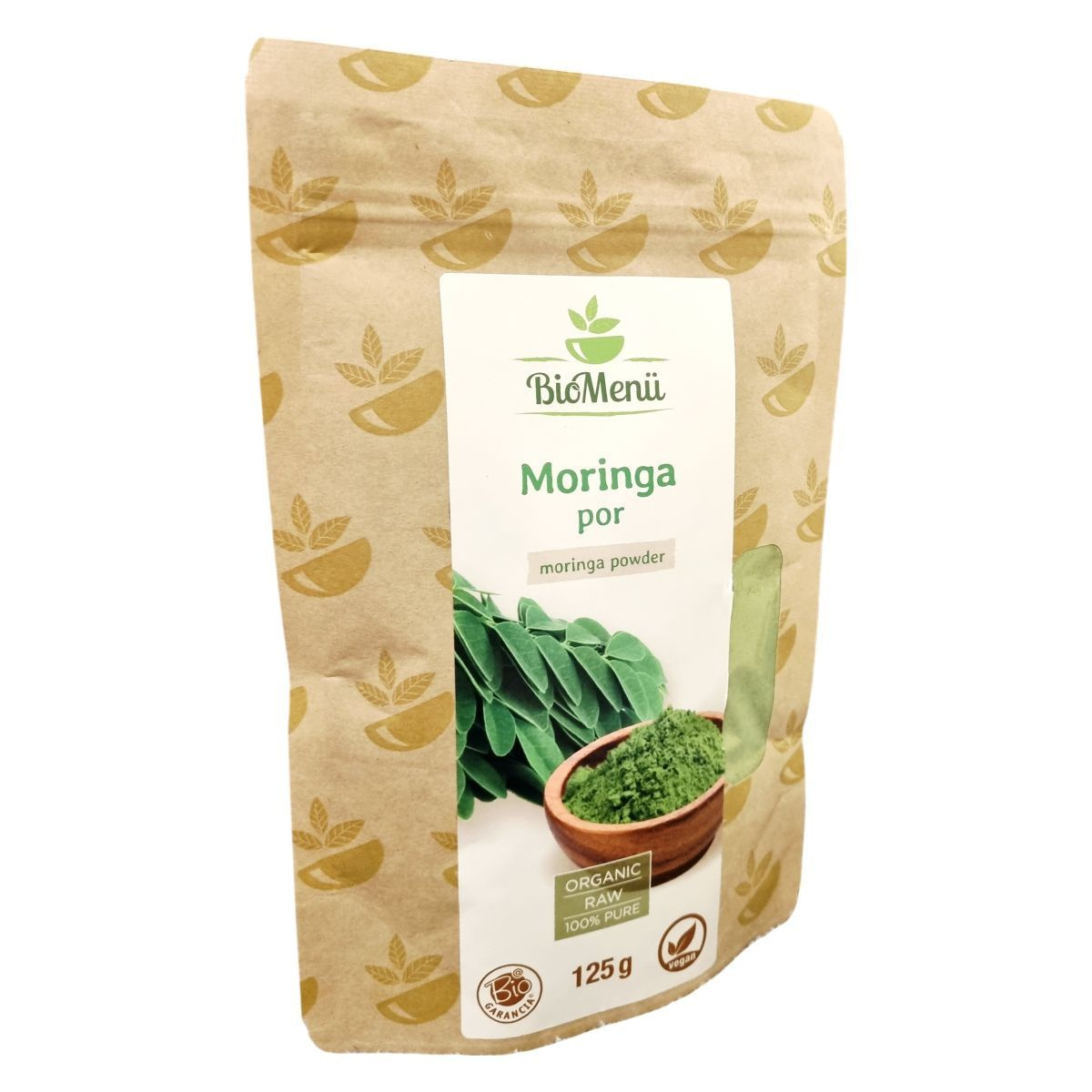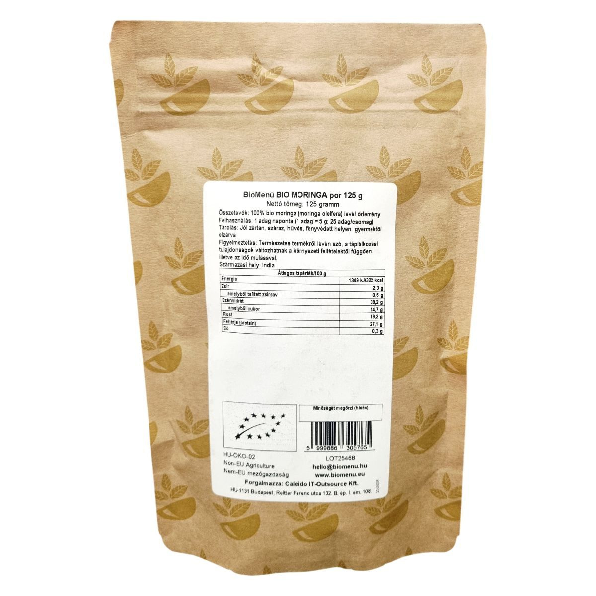 A BioMenü BIO Moringa por minőségi magyarországi forgalmazásban, Indiából származó, bio tanúsítvánnyal rendelkező, 100% tiszta moringa levél őrlemény, amelyet a nem EU-s mezőgazdaság területén állítanak elő. A csomag 125 gramm tömegű, és 25 adag 5 grammos egységből áll. A termék vegán és kizárólag természetes alapanyagokat tartalmaz, így biztonságos választás lehet különféle étrendi igényekhez. A csomagolás bio garanciát visel, és a helyes tárolás biztosítása érdekében száraz, fényvédett és gyermektől elzárt helyen ajánlott tartani.