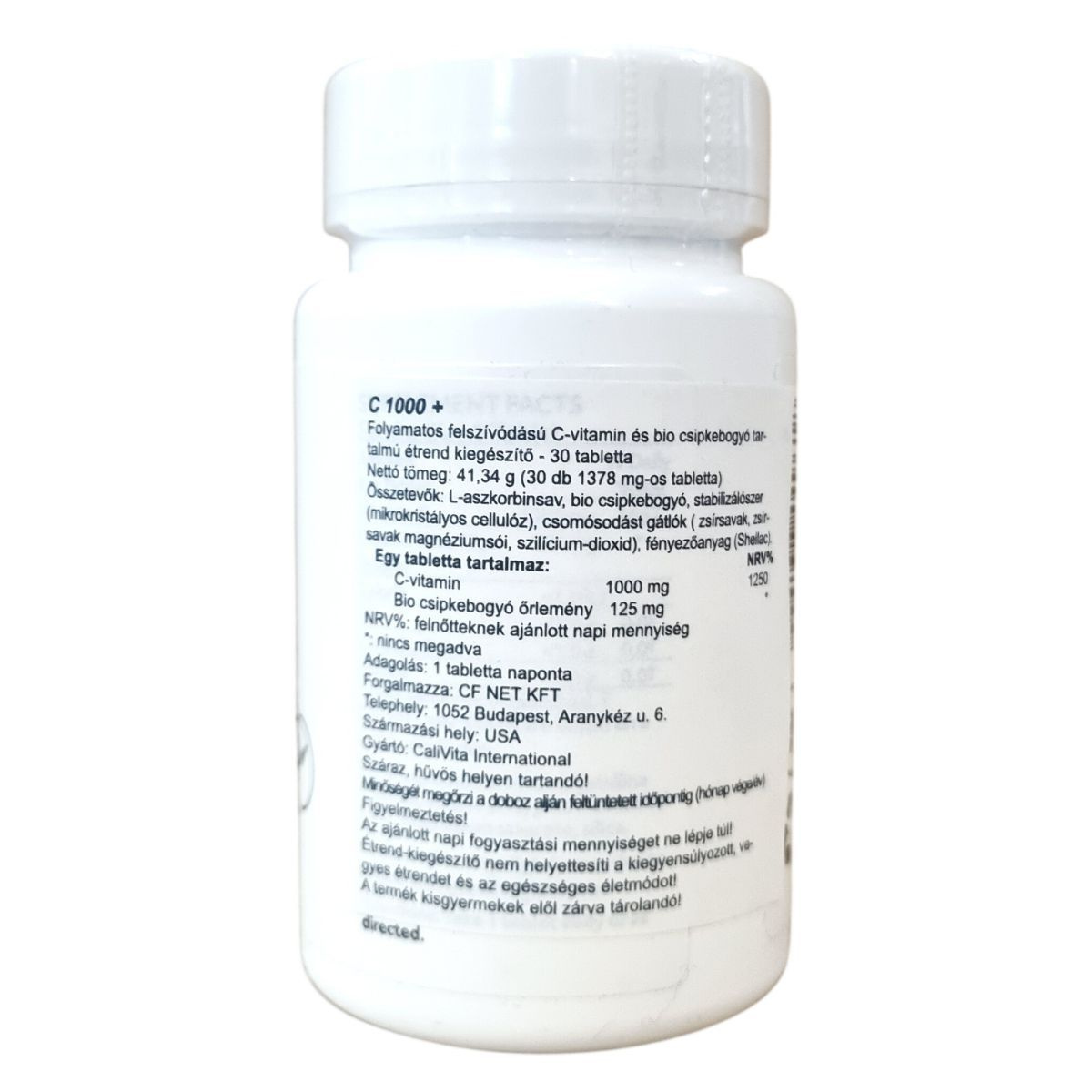 A C-1000+ étrend-kiegészítő tablettánként 1378 mg tömegű, folyamatos felszívódású C-vitamint és bio csipkebogyó őrleményt tartalmaz. A termék az Egyesült Államokban készült a Calivita International gyártásában, aki a legmagasabb minőségű természetes alapanyagok felhasználásával, a legszigorúbb jó gyártási gyakorlat alapján állítja elő készítményeit. A dobozt szorosan zárva, száraz, hűvös helyen kell tárolni, a termék biztonsági zár nélkül nem használható. A forgalmazó a CF NET KFT, amely a készítményt Magyarországon forgalmazza. A termék kizárólag étrend-kiegészítő céllal készült, és nem helyettesíti a kiegyensúlyozott étrendet, sem az egészséges életmódot.