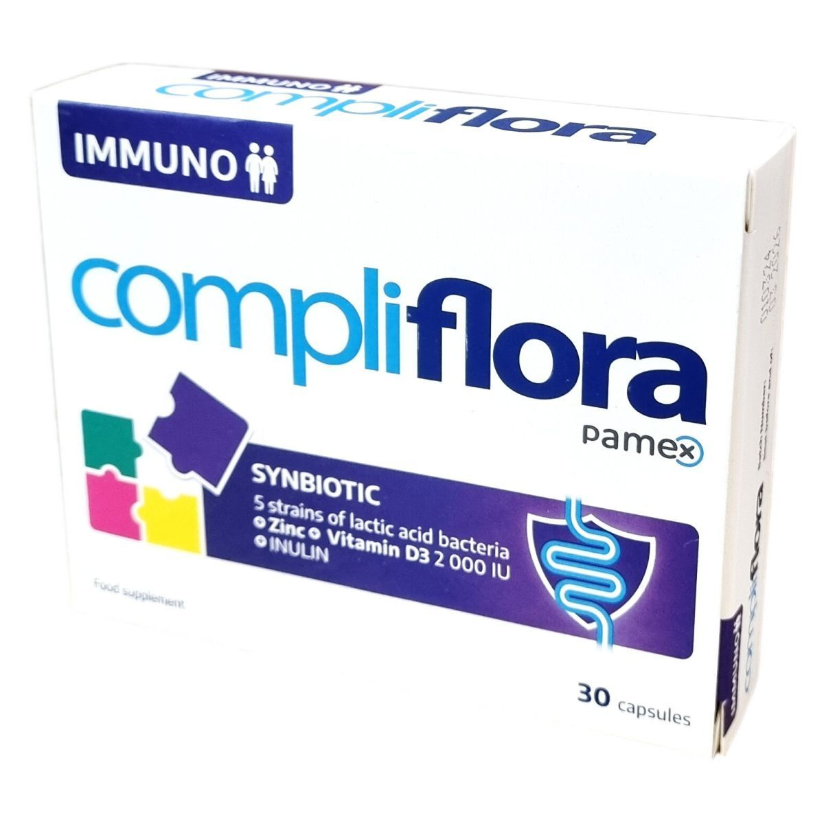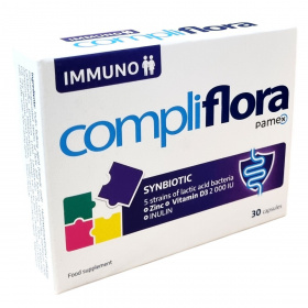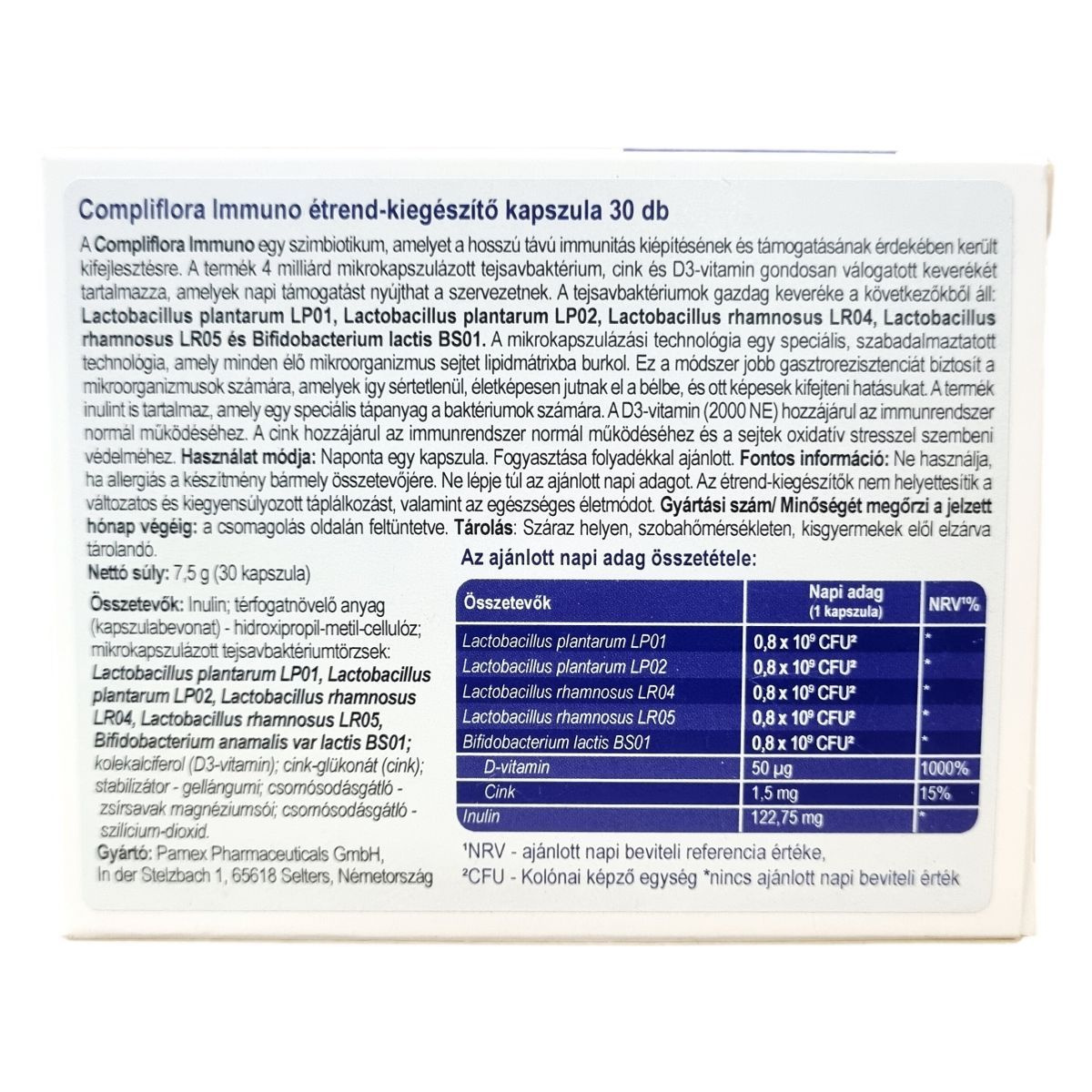 A Compliflora Immuno egy szimbiotikum, amelyet a hosszú távú immunitás kiépítésének és támogatásának céljából fejlesztettek ki. A termék 4 milliárd mikrokapszulázott tejsavbaktériumot, cinket és D3-vitamint tartalmazó keveréket nyújt, amely napi támogatást adhat a szervezetnek. Az ötféle tejsavbaktérium Lactobacillus plantarum LP01 és LP02, Lactobacillus rhamnosus LR04 és LR05, valamint Bifidobacterium lactis BS01 törzsekből áll. A mikrokapszulázási technológia egy szabadalmaztatott eljárás, amely lipidmátrixba burkolja az élő mikroorganizmusokat, ezáltal javítva gasztrorezisztenciájukat, így életképes sejtek jutnak el a bélbe, ahol kifejthetik hatásukat. A termék inulint is tartalmaz, amely speciális tápanyagként szolgál a hasznos baktériumok számára. A D3-vitamin hozzájárulhat az immunrendszer normál működéséhez, a cink pedig az immunrendszer normál működésében és a sejtek oxidatív stresszel szembeni védelmében játszhat szerepet.