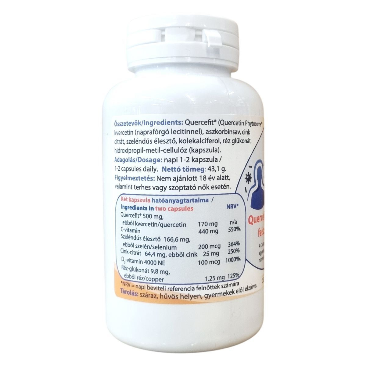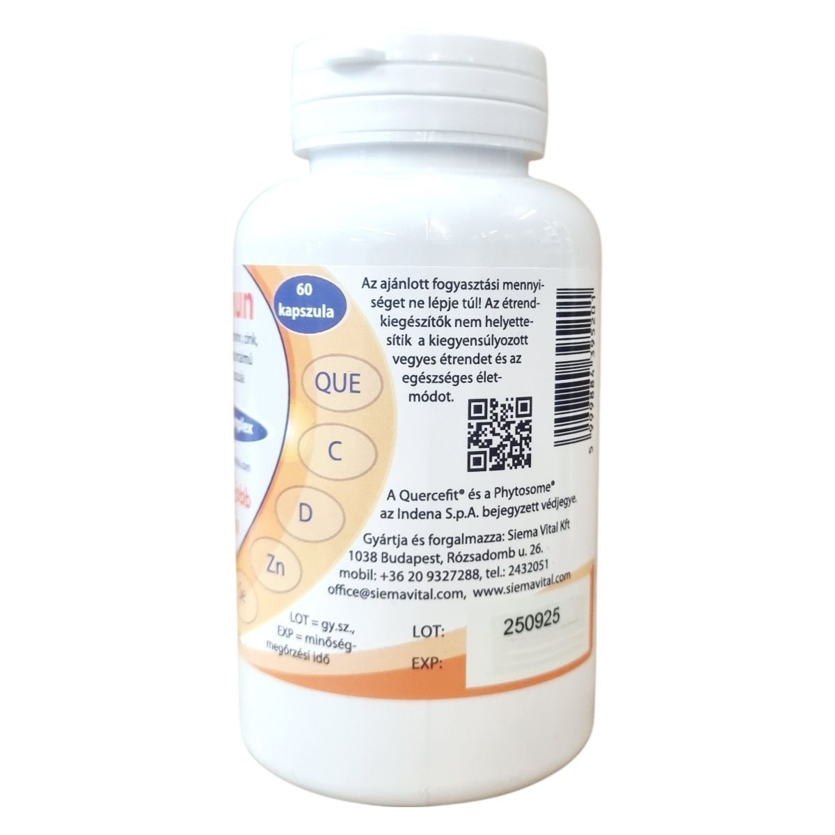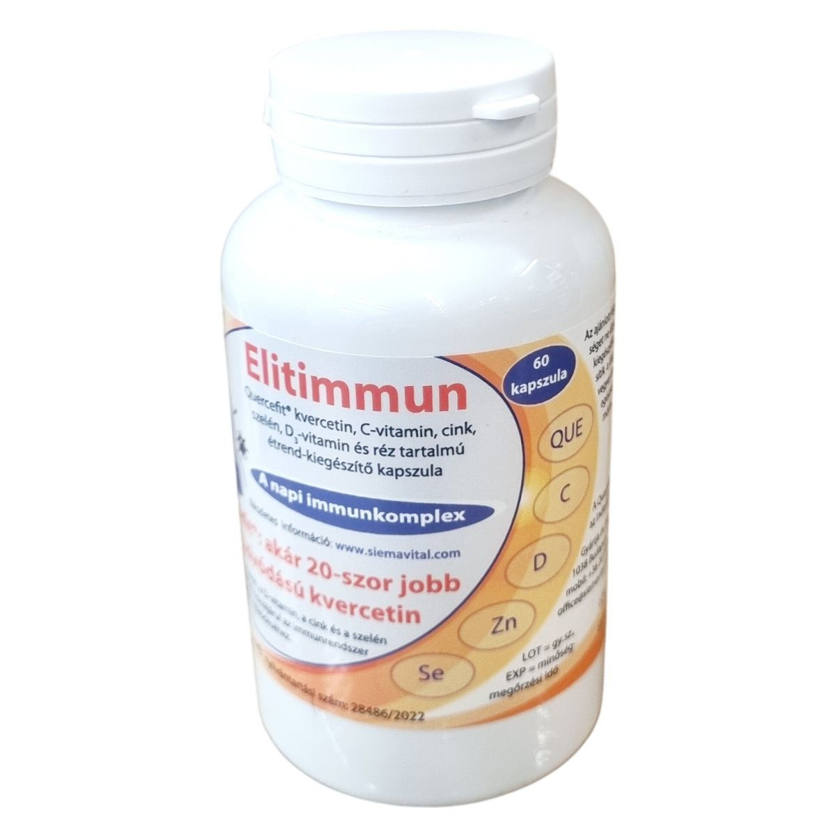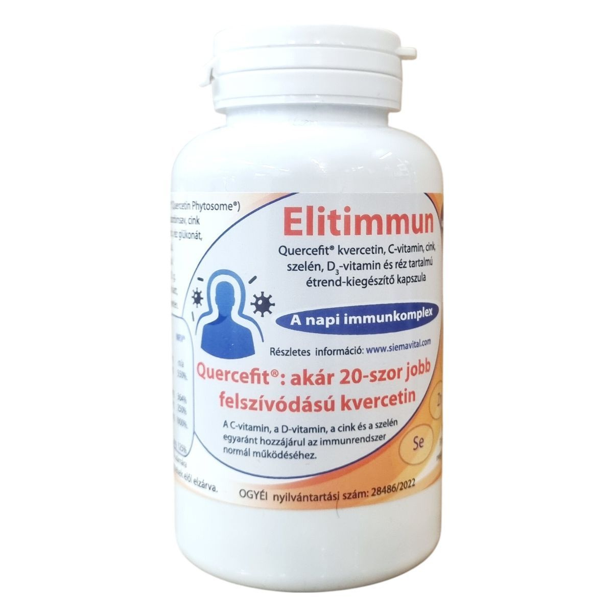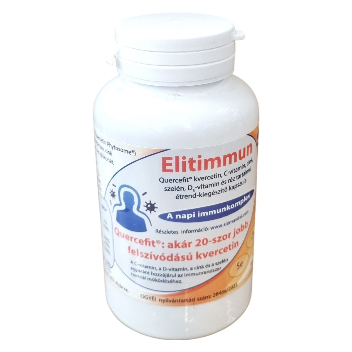 Az Elitimmun Quercefit® étrend-kiegészítő kapszulák a Quercefit® komplexet tartalmazzák, amely a kvercetin jobb felszívódását segíti elő, akár 20-szoros hatékonysággal a hagyományos formákhoz képest. A termék az immunrendszer támogatására összeállított, C-vitamin, D-vitamin, cink, szelén és réz komplexét tartalmazza, amelyek együttesen hozzájárulhatnak az immunrendszer normál működéséhez. A kapszulák adagolása naponta 1-2 darab, és nem helyettesítik a kiegyensúlyozott vegyes étrendet és egészséges életmódot. A termék Magyarországon OGYÉI nyilvántartási számmal rendelkezik, és a gyártó, valamint a forgalmazó a Siema Vital Kft. A Quercefit® és Phytosome® védjegyek az Indena S.p.A. bejegyzett márkái. A terméket száraz, hűvös helyen kell tárolni, gyermekek számára hozzáférhetetlen helyen.