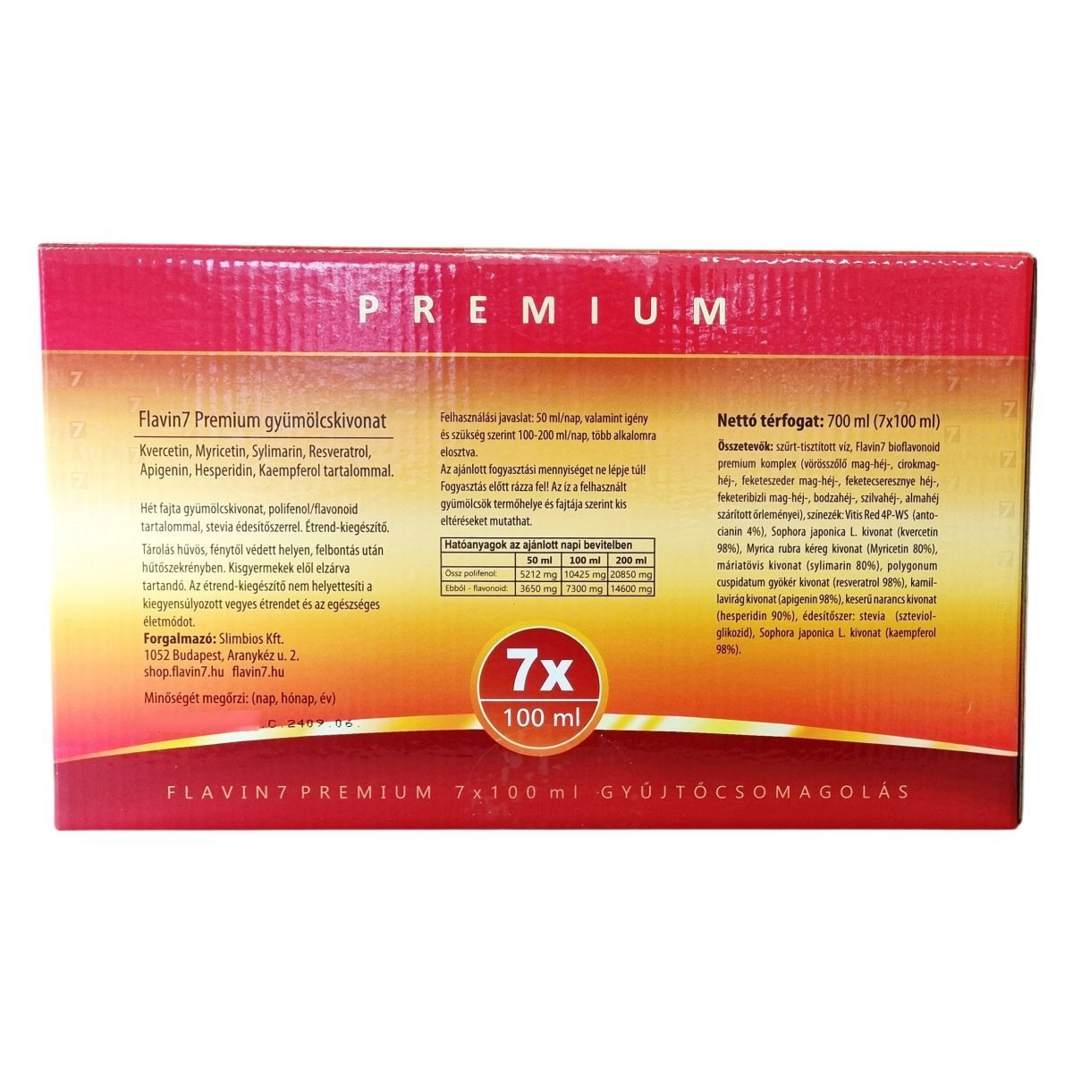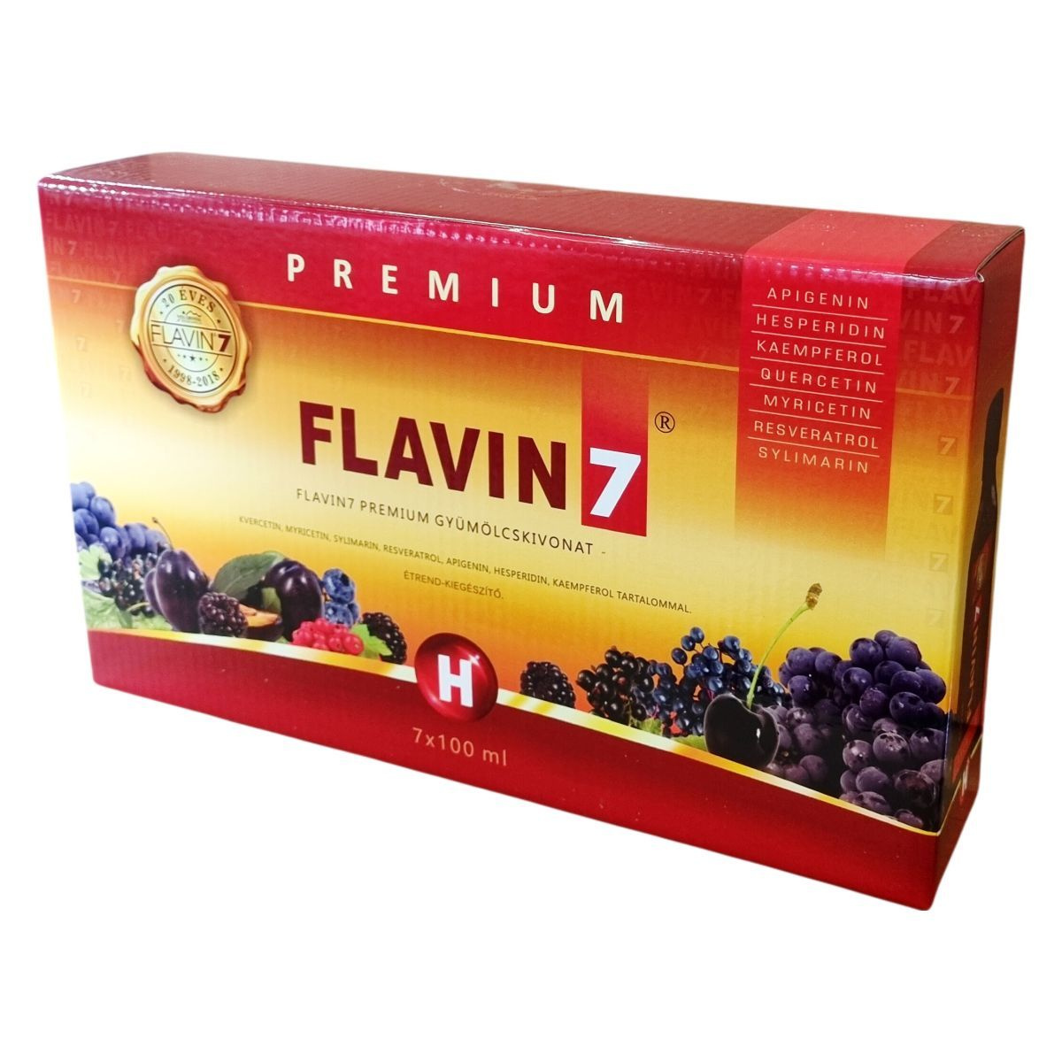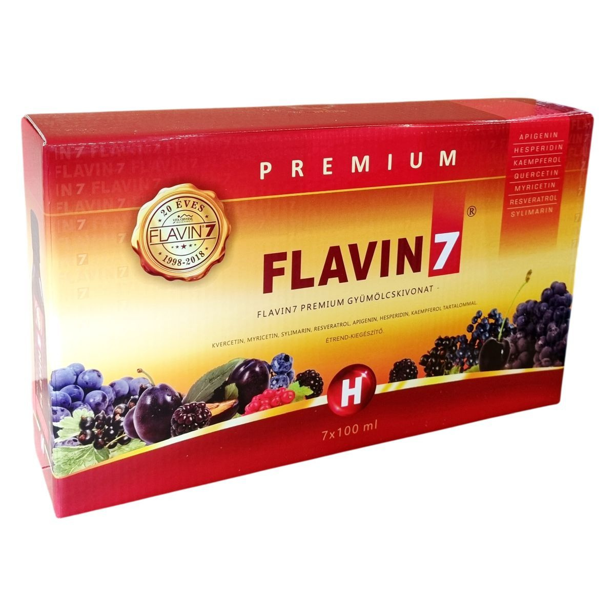 Flavin7 Premium gyümölcskivonat kvercetin, myricetin, silymarin, resveratrol, apigenin, hesperidin és kaempferol tartalommal. Nettó térfogat: 700 ml (7x100 ml). 7x100 ml-es gyűjtőcsomagolás.