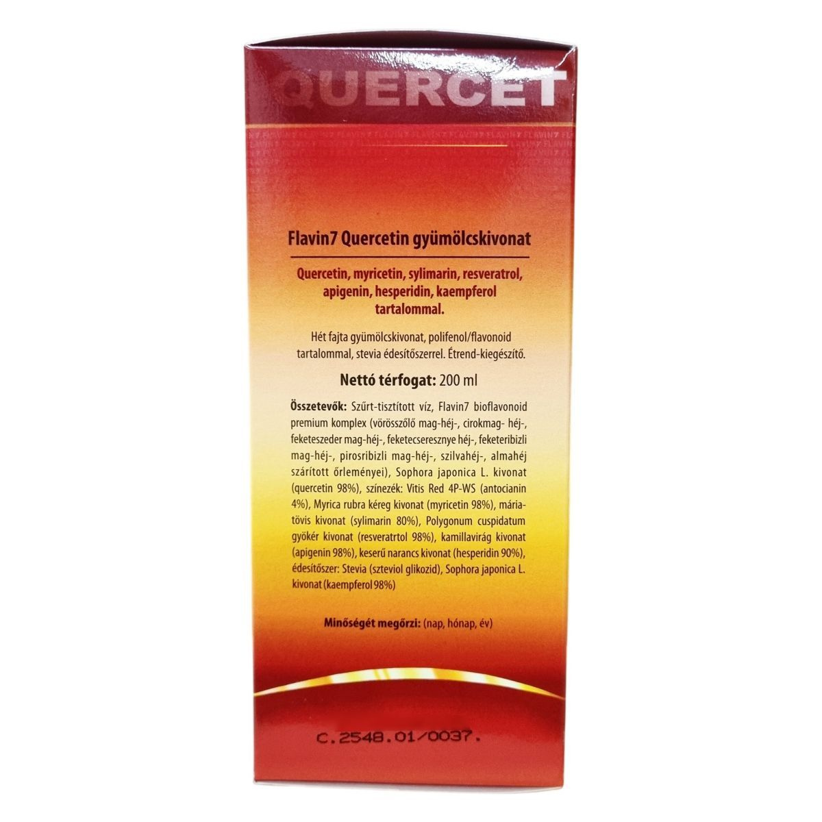 Összetevők: quercetin (kvercetin), Flavin 7 bioflavonoid komplex (vörös szőlő mag-héj szárítmány, feketeszeder mag-héj szárítmány, feketecseresznye héj szárítmány, feketeribizli mag-héj szárítmány, pirosribizli mag-héj szárítmány, szilva héj szárítmány, almahéj szárítmány).
