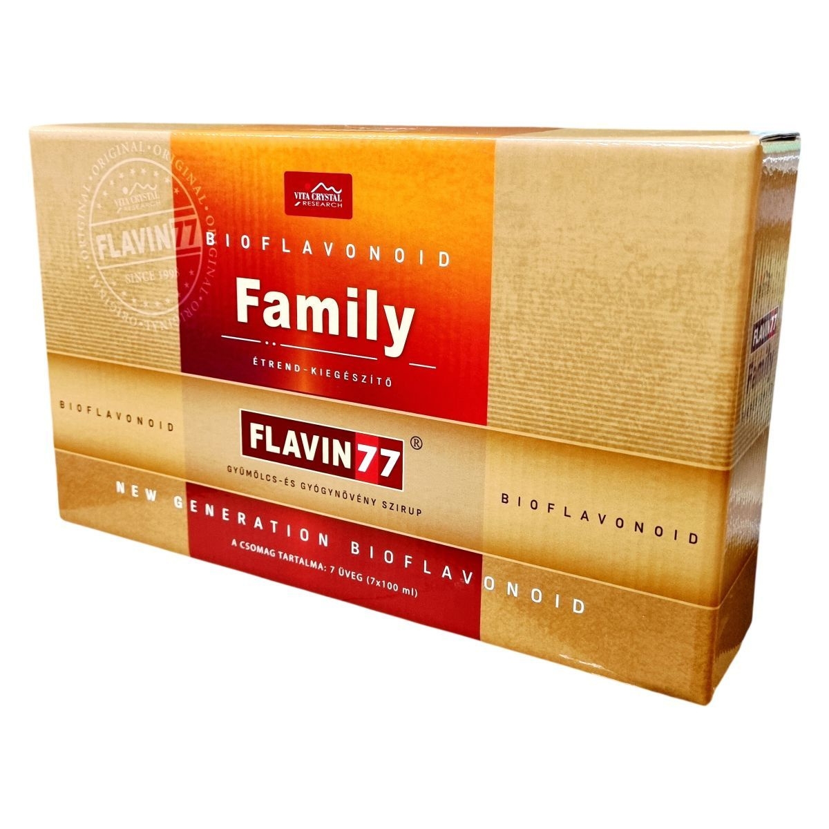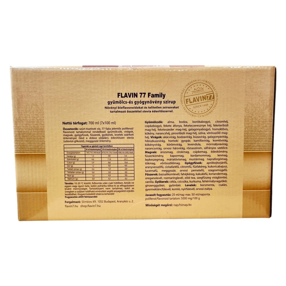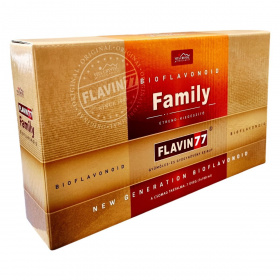 A FLAVIN 77 Family gyümölcs- és gyógynövény szirup 7 db 100 ml-es üvegből álló csomagban kerül forgalomba. A termék 77 féle különböző gyümölcs, virág, mag, gyógynövény, fűszer, gyökér és levél szárított őrleményét tartalmazza, melyek jelentős polifenol és flavonoid tartalommal rendelkeznek. Az összetevők között szerepelnek például alma, bodza, fekete áfonya, homoktövis, akácvirág, kamillavirág, ánizsmag, apróbojtorjánfű, bazsalikomlevél, kurkuma, valamint borsmenta és csalánlevél is. Az édesítését természetes stevia szteviol-glikoziddal végzik, továbbá meggyszár őrlemény is jelen van benne. A készítmény tartósítószer-mentes, ezért a felhasználásánál fontos odafigyelni a tárolásra és a higiéniai szabályokra, hogy az erjedést elkerüljék. Az ajánlott napi fogyasztási mennyiség 20 ml, maximum 50 ml lehet, amely hozzájárulhat a szervezet bioflavonoid- és polifenol ellátásához.