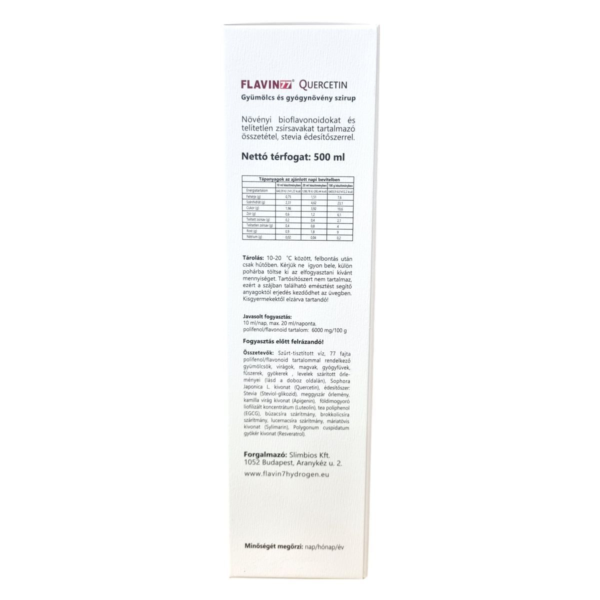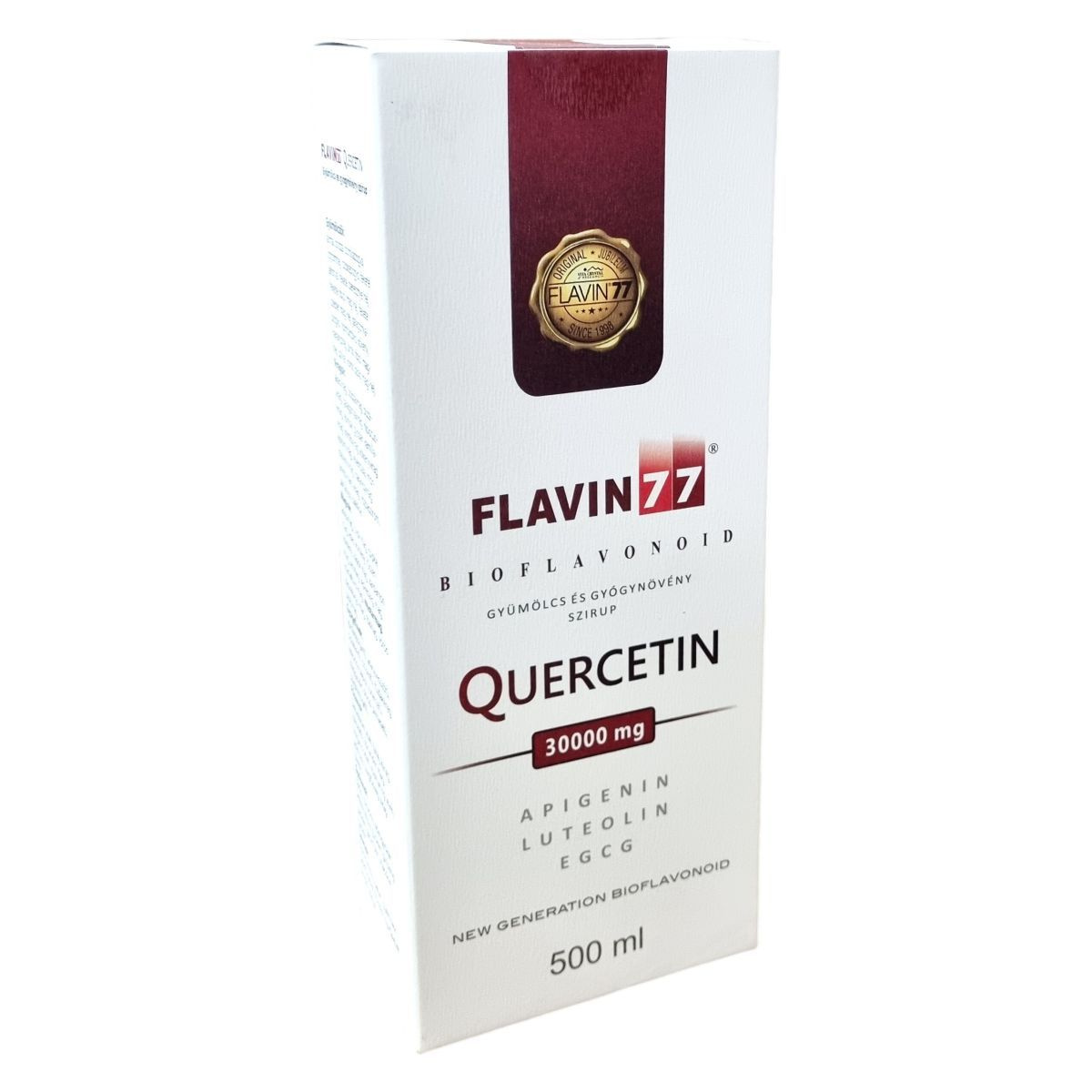 A Flavin77® Quercetin gyümölcs és gyógynövény szirup egy egyedülálló növényi bioflavonoid és polifenol forrás, amely 77 különböző gyümölcs, virág, mag, gyógynövény, fűszer, gyökér és levél szárított őrleményét tartalmazza. Fő hatóanyagai közé tartozik a quercetin, apigenin, luteolin és az EGCG. A termék stevia alapú édesítőszerrel készült, tartósítószert nem tartalmaz és polifenol/flavonoid tartalma 6000 mg/100 g. A készítmény gazdag a természetes összetevők széles palettájában, mint például alma, bodza, fekete áfonya, kamilla, máriatövis, gyömbér, zöld tea és sok egyéb, melyek mind hozzájárulhatnak a szervezet támogatásához. A termék használata előtt felrázandó, ajánlott napi adagja 10-20 ml. A szirup mint telítetlen zsírsavakban is gazdag, ezáltal komplex támogatást nyújthat az egészséges táplálkozás részeként.