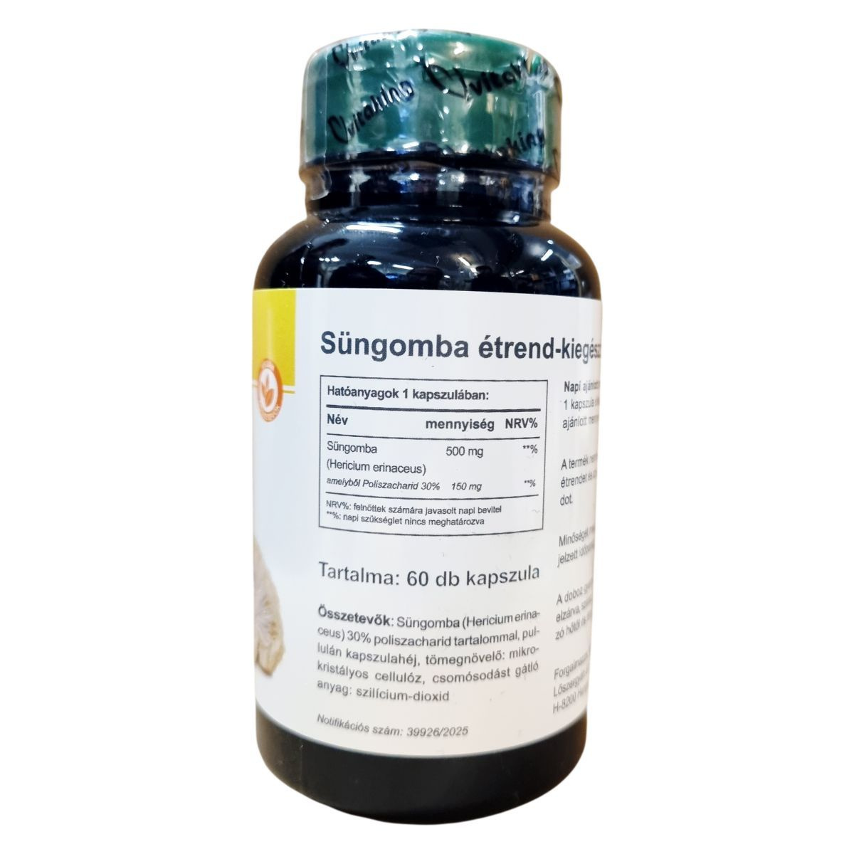 Süngomba (Hericium erinaceus) 30% poliszacharid tartalommal, pullulán kapszulahéj, tömegnövelő: mikrokristályos cellulóz, csomósodást gátló anyag: szilícium-dioxid