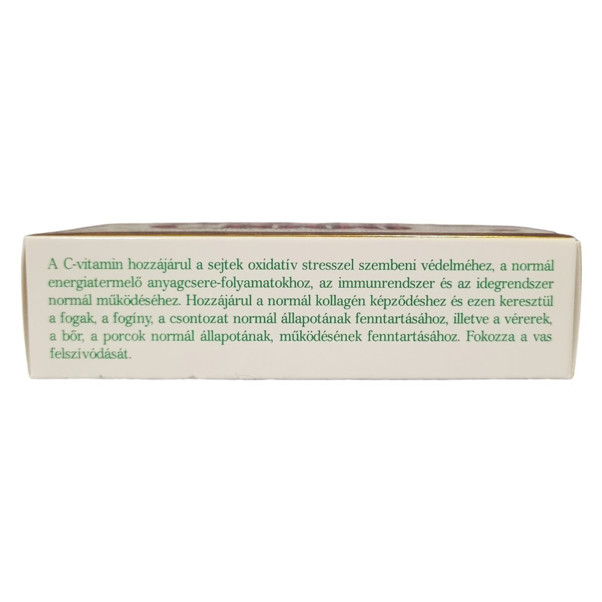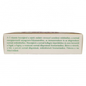 A C-vitamin hozzájárulhat a sejtek oxidatív stresszel szembeni védelméhez, a normál energiatermelő anyagcsere-folyamatokhoz, valamint az immunrendszer és idegrendszer normál működéséhez. Támogathatja a normál kollagén képződést, mely fontos lehet a fogak, fogíny, csontozat, vérerek, bőr és porcok egészségének fenntartásában. A készítmény továbbá segítheti a vas felszívódását. Új, környezetkímélőbb csomagolásban kerül forgalomba, amely kevesebb műanyagot és fémet tartalmaz, miközben megfelel az élelmiszerbiztonsági előírásoknak. A termék 30 db tablettát tartalmaz, mely kezelés során étrend-kiegészítőként alkalmazandó, nem helyettesíti a vegyes étrendet és az egészséges életmódot.