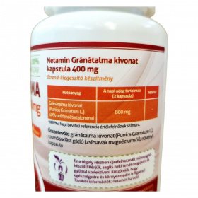A Netamin Gránátalma kivonat kapszula egy étrend-kiegészítő készítmény, amely 400 mg gránátalma kivonatot tartalmaz, 40% polifenol tartalommal. A termék 100% vegán, és részben újrafelhasznált műanyagból készült tégelyben kerül forgalomba, ami hozzájárulhat a környezettudatos életmódhoz. A kapszula vegetáriánus, és a gránátalma kivonat mellett csomósodást gátló anyagokat is tartalmaz. A termék használata során fontos, hogy az ajánlott napi mennyiséget ne lépjük túl, és a kapszulákat száraz, hűvös helyen tároljuk. A termék nem helyettesíti a vegyes étrendet és az egészséges életmódot, és gyermekek elől elzárva tartandó.