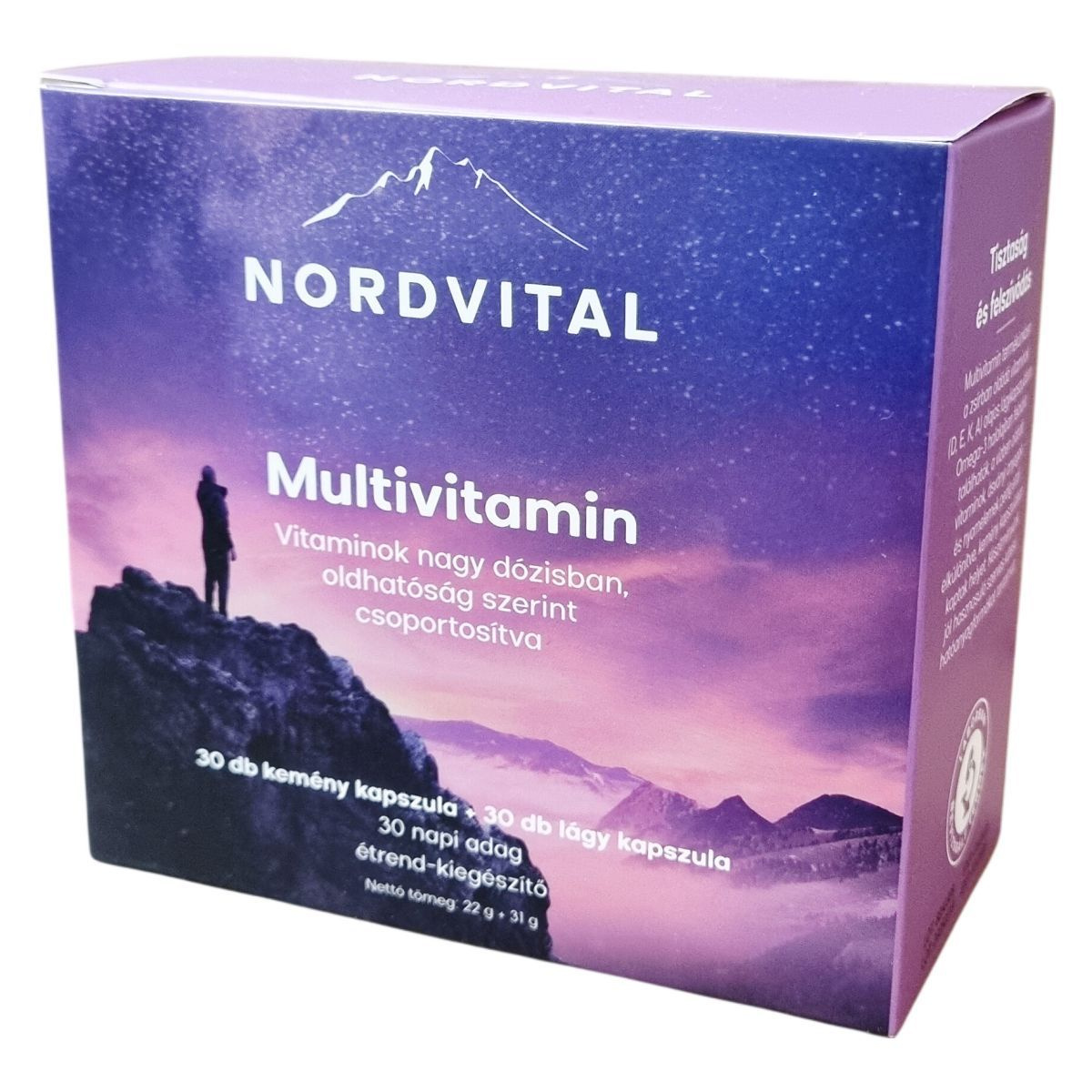 A Nordvital Multivitamin egy kétféle kapszulatípusba csoportosított étrend-kiegészítő, amely nagy dózisú vitaminokat tartalmaz oldhatóság szerint elkülönítve. A zsírban oldódó vitaminok (A, D, E, K) olajos lágy kapszulában, Omega-3 halolajban oldva találhatók, míg a vízben oldódó vitaminok, ásványi anyagok és nyomelemek kemény kapszulában helyezkednek el. A készítmény jól hasznosuló, szerves kötésű hatóanyagformákat tartalmaz, melyek laboratóriumban bevizsgáltak és GMP minősítéssel rendelkező gyártóüzemben készülnek. A termék használata napi 1 kemény és 1 lágy kapszula bevételét jelenti étkezés után. A multivitamin laktóz-, glutén- és GMO-mentes, így különböző diétákhoz is alkalmas táplálékkiegészítő lehet. Az étrend-kiegészítő nem helyettesíti a változatos és kiegyensúlyozott étrendet, és fogyasztása során az ajánlott adagot nem szabad túllépni. Tárolása száraz, napfénytől védett helyen, szobahőmérsékleten, gyermekek elől elzárva javasolt.