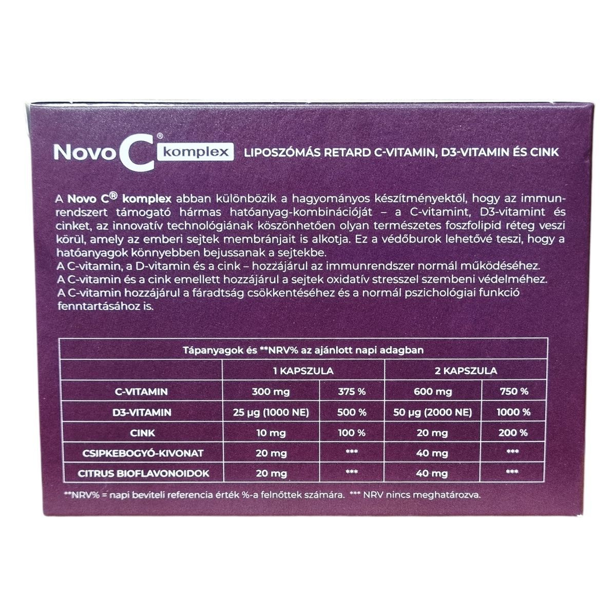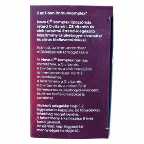 A Novo C® komplex a hagyományos készítményektől eltérően liposzómás bevonattal készült, amely egy természetes foszfolipid réteget képez a C-vitamin, D3-vitamin és cink hatóanyagok körül. Ez a védőburok segítheti a hatóanyagok hatékonyabb sejtbe jutását. A termék hozzájárulhat az immunrendszer normál működéséhez, a sejtek oxidatív stresszel szembeni védelméhez, a fáradtság csökkentéséhez és a normál pszichológiai funkció fenntartásához. A csipkebogyó-kivonat és a citrus bioflavonoidok természetes összetevői a komplexnek, amelyek további támogatást nyújthatnak az egészség megőrzéséhez. A készítmény 8 éves kortól ajánlott, és napi 1-2 kapszula fogyasztása javasolt bő folyadékkal, lehetőleg reggel.