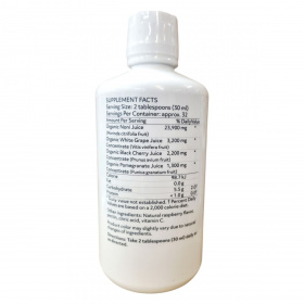Organikus noni gyümölcslé, organikus fehér szőlőlé koncentrátum, organikus fekete cseresznye lé koncentrátum, organikus gránátalma lé koncentrátum, természetes málnaaroma, pektin, citromsav, C-vitamin