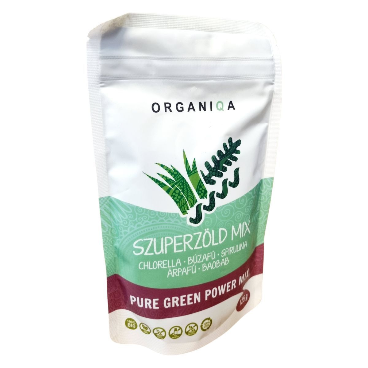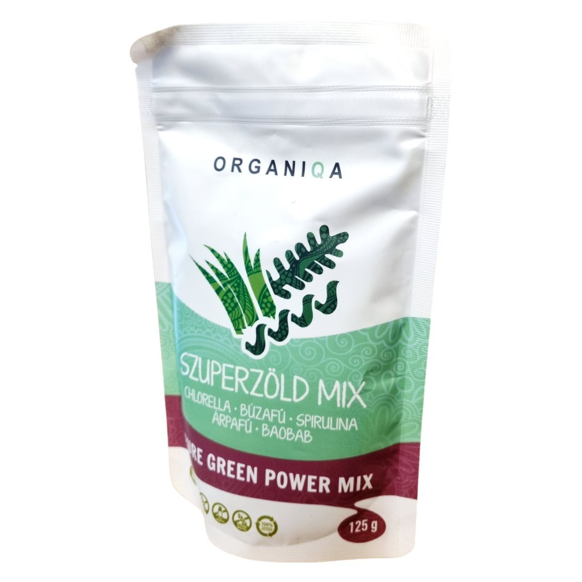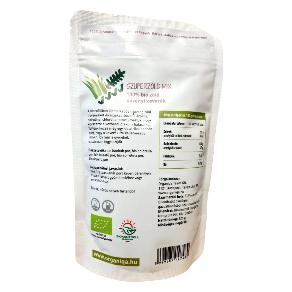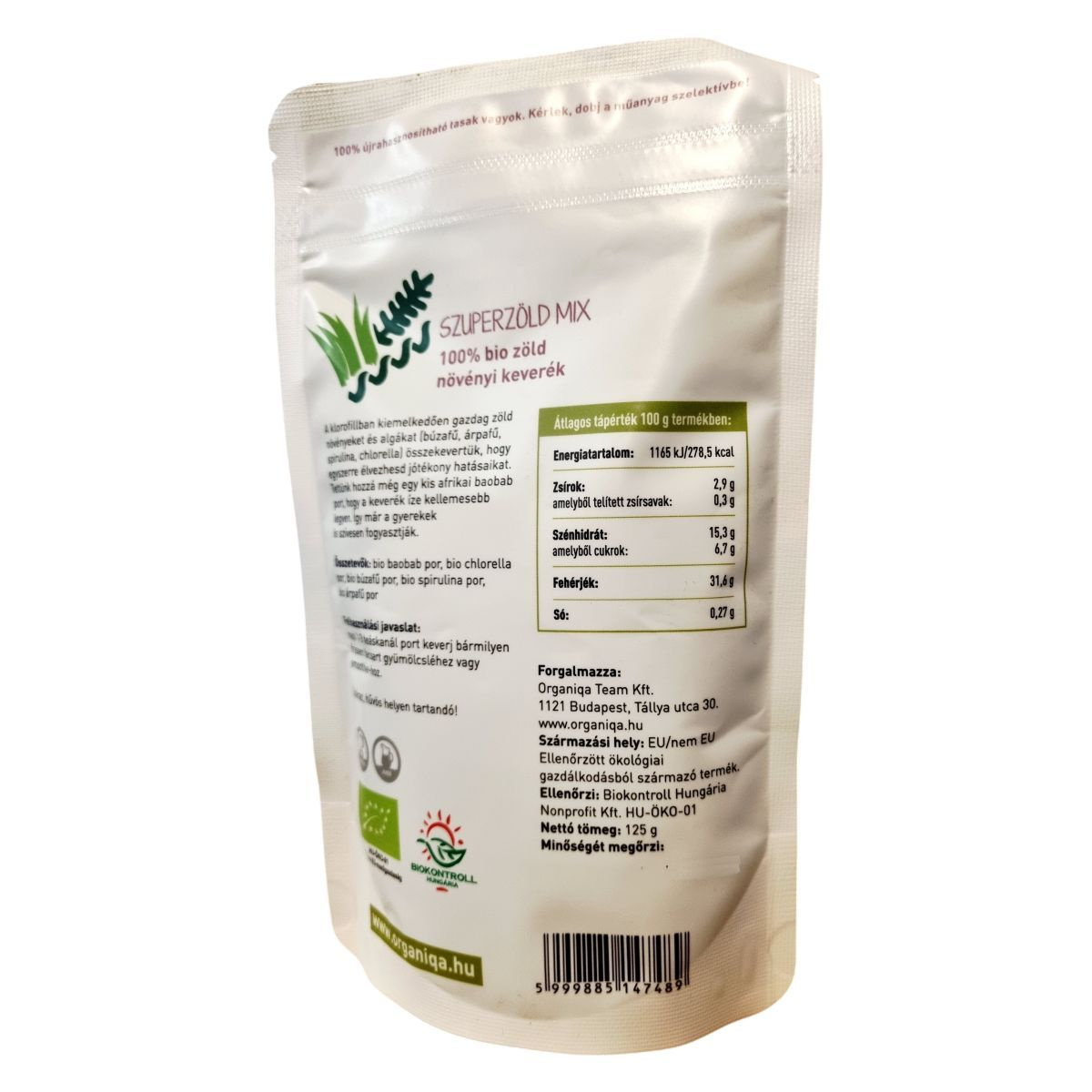 Az ORGANIQA SZUPERZÖLD MIX egy 100% bio zöld növényi keverék, amely klorofillban gazdag zöld növényeket és algákat tartalmaz, mint a búzafű, árpafű, spirulina és chlorella. Ezeket az összetevőket afrikai baobab porral egészítették ki, hogy a keverék íze kellemesebb legyen, így a gyerekek is szívesen fogyaszthatják. A termék 100% újrahasznosítható tasakban kapható, és ellenőrzött ökológiai gazdálkodásból származik. A termék forgalmazója az Organiqa Team Kft., és a Biokontroll Hungária Nonprofit Kft. ellenőrzi.