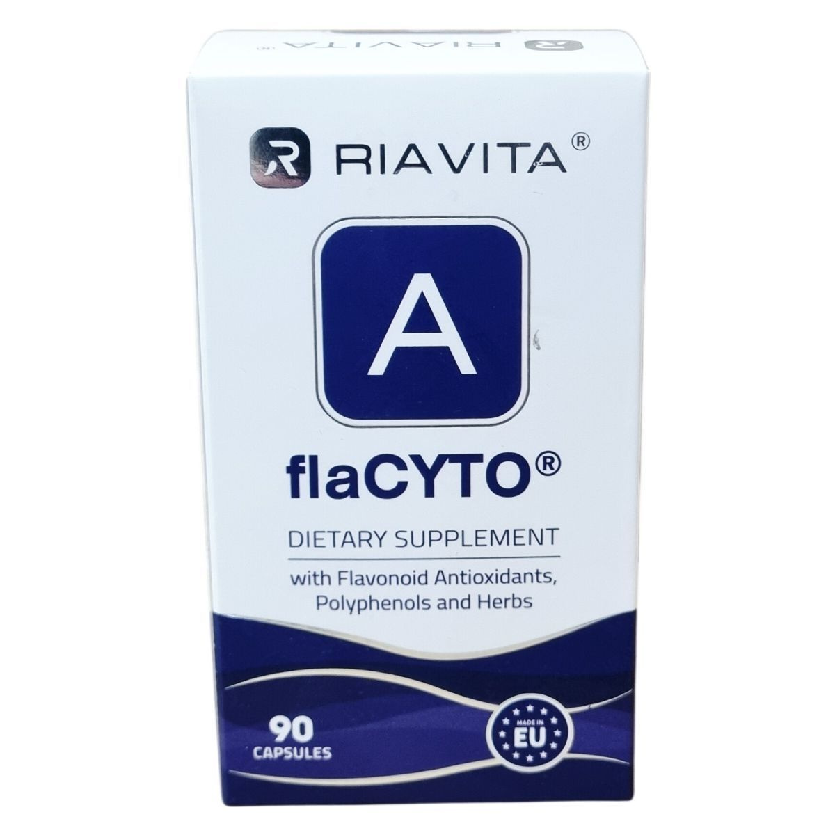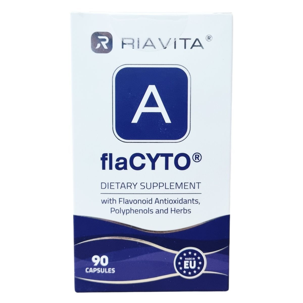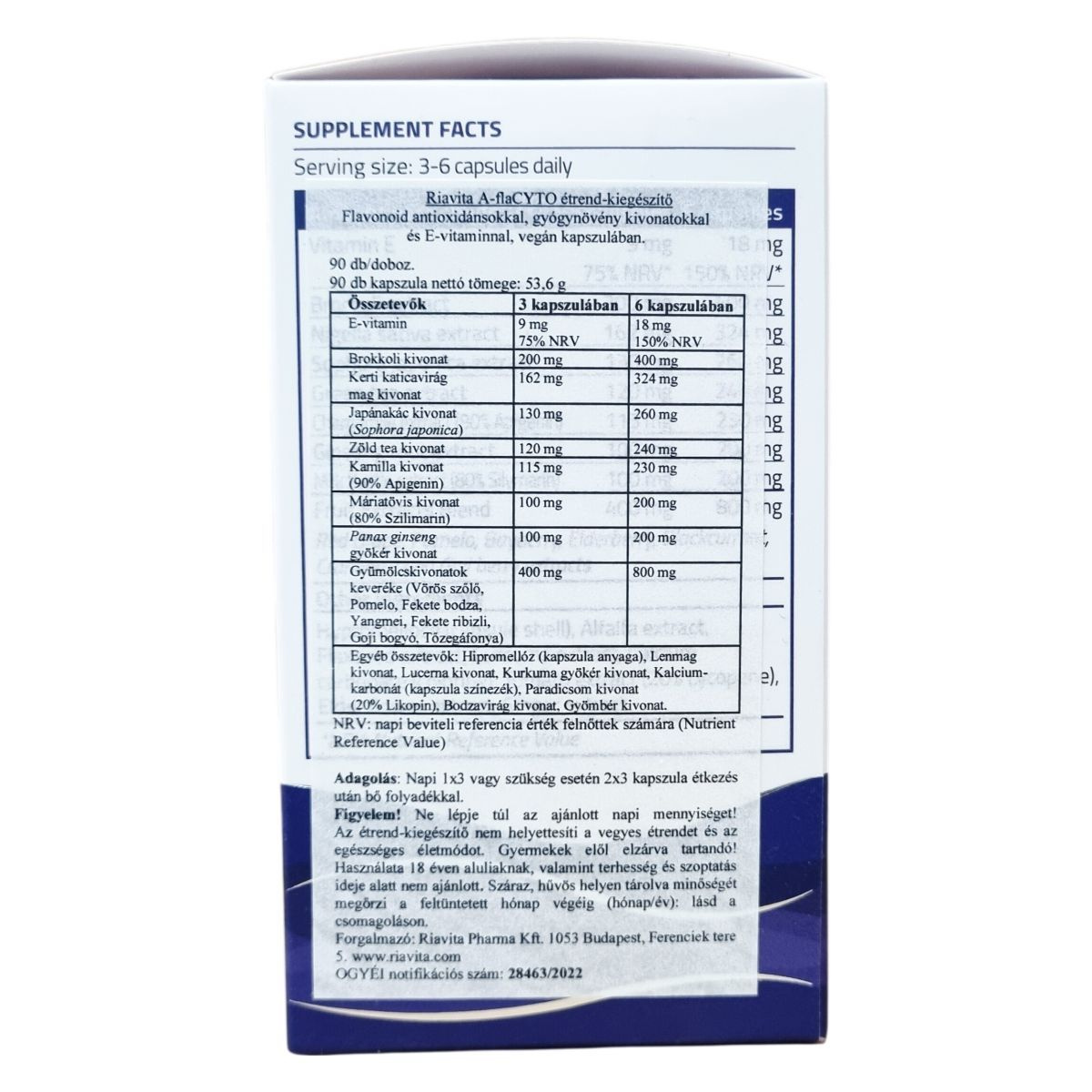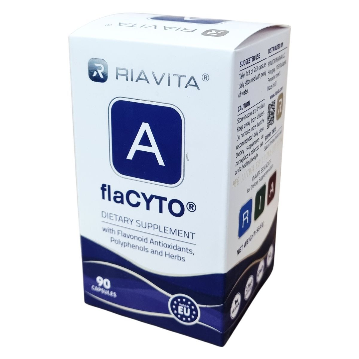 A Riavita A-flaCYTO étrend-kiegészítő kapszulái flavonoid antioxidánsokat, polifenolokat és gyógynövény kivonatokat tartalmaznak, amelyeket vegán kapszulába zártak. A termék összetevői között szerepel többek között E-vitamin, brokkoli-, kerti katicavirág-, japánakác-, zöld tea-, kamilla-, máriatövis-, és Panax ginseng kivonat, valamint gyümölcskivonatok keveréke. A kapszula anyaga hipromellóz, kiegészítő összetevőként pedig lenmag-, lucerna-, kurkuma-, paradicsom-, bodzavirág- és gyömbér-kivonatok találhatók. A készítmény Magyarországon készült az Európai Unióban, és GMP tanúsítvánnyal rendelkezik, emellett nem tartalmaz GMO-t vagy titán-dioxidot. Fontos, hogy az ajánlott adagolást ne lépjék túl, és hogy az étrend-kiegészítő nem helyettesíti a kiegyensúlyozott étrendet és az egészséges életmódot.