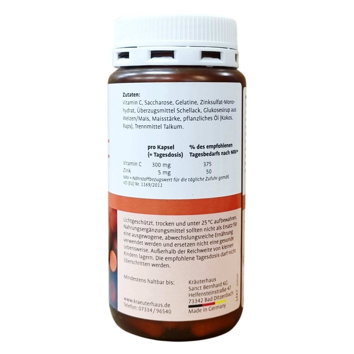 Ez a németországi gyártású, hosszú hatású kapszula C-vitamint és cinket tartalmaz, melyek mennyisége megfelel a napi beviteli referenciaértékeknek. A kapszula összetevői között megtalálhatóak az L-aszkorbinsav, zselatin, valamint növényi eredetű olajok és különféle töltőanyagok. A termék nem helyettesíti a változatos és kiegyensúlyozott étrendet és az egészséges életmódot, továbbá gyermekektől elzárva kell tartani. A kapszulát javasolt főétkezések előtt bő folyadékkal bevenni, és száraz, hűvös helyen tárolni.