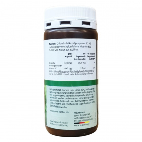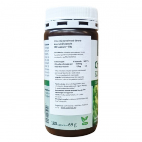 A Chlorella a vitaminok gazdag tárháza: magas arányban tartalmazza a B csoporthoz tartozó vitaminokat, C- és E- vitaminokat, biológiailag kötött ásványi anyagokat: foszfort, káliumot, magnéziumot, kalciumot (ezek koncentrációja nagyobb, mint a többi szárazföldi növénynél) és nyomelemeket: vasat, mangánt, cinket, rezet, kobaltot (aminosav kelát-kötés). Az egyik legkiválóbb jódforrás. Magas rosttartalma által magához vonzza a belekben lerakódott salakanyagot, főleg a nehézfémeket, melyek ezután széklettel távoznak. Klorofill tartalma révén a beleket fertőtleníti, pozitívan befolyásolhatja a növekedést, az anyagcserét és a sejtlégzést. Hatóanyagok - 1 kapszulában: Chlorella alga: 320 mg, Összetevők: Chlorella por (76 %), zselatin.