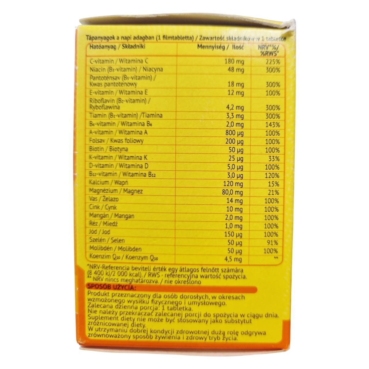 A termék vitaminokat, ásványi anyagokat és koenzim Q10-et tartalmaz, amelyek hozzájárulhatnak a fáradtság csökkentéséhez, a normál energiatermelő anyagcsere-folyamatokhoz és az immunrendszer normál működéséhez.
