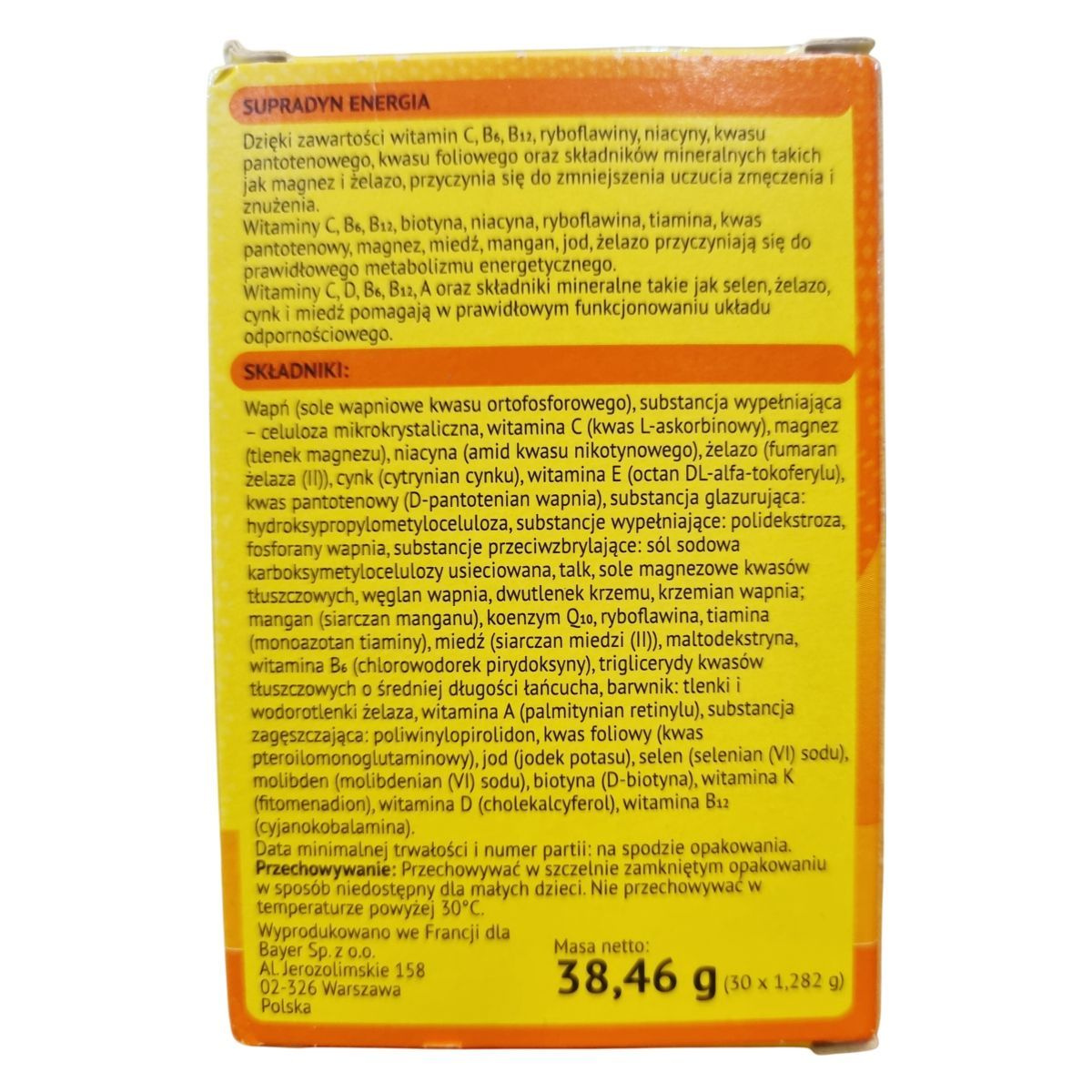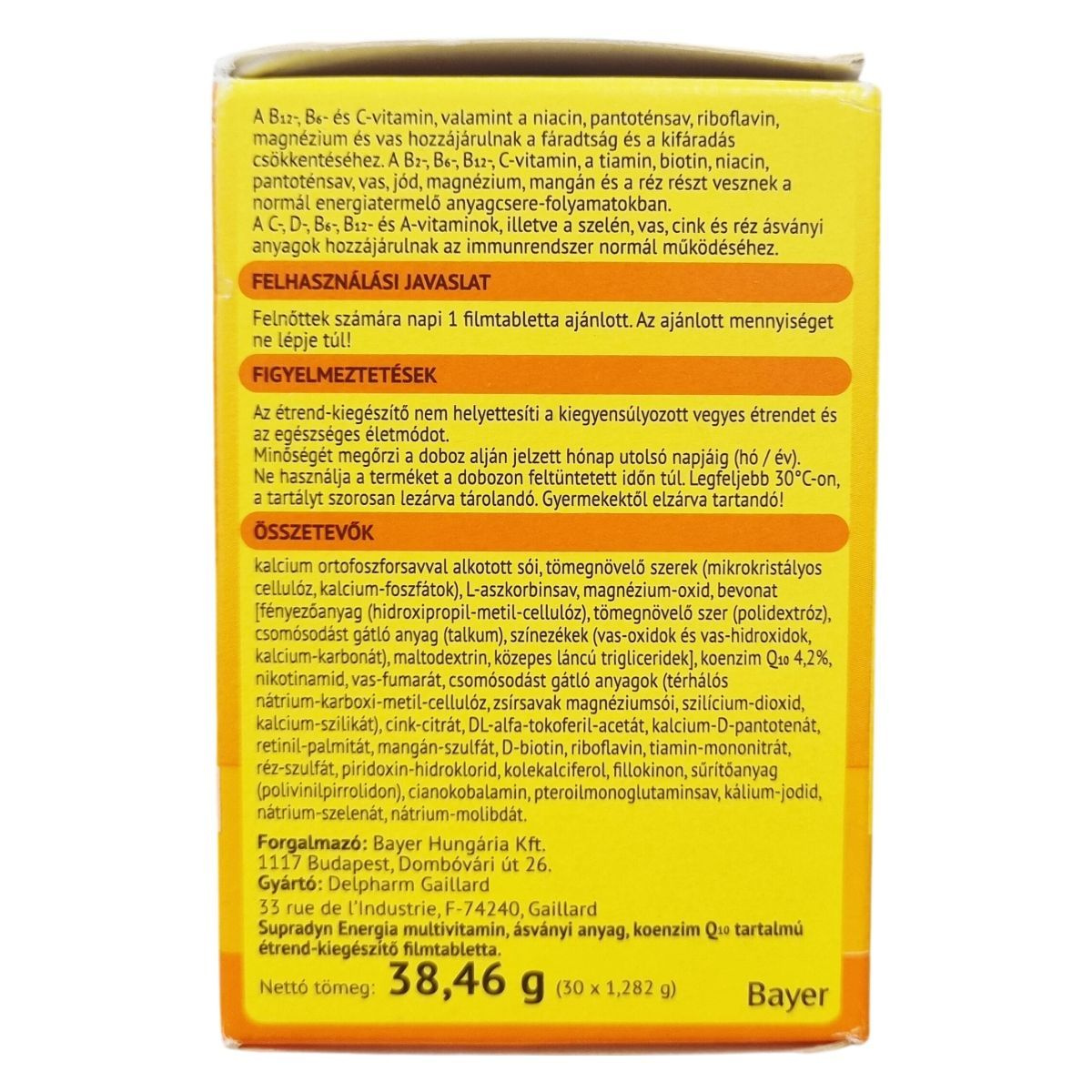 A B1-, B2-, B6-, B12- és C-vitamin, valamint a niacin, pantoténsav, riboflavin, magnézium és vas hozzájárulhat a fáradtság és kifáradás csökkentéséhez. A vitaminok és ásványi anyagok szerepet játszanak a normál anyagcserében, energiatermelésben és immunrendszer támogatásában. Kiszerelés: 30 db filmtabletta, nettó tömeg: 38,46 g (30 × 1,282 g).